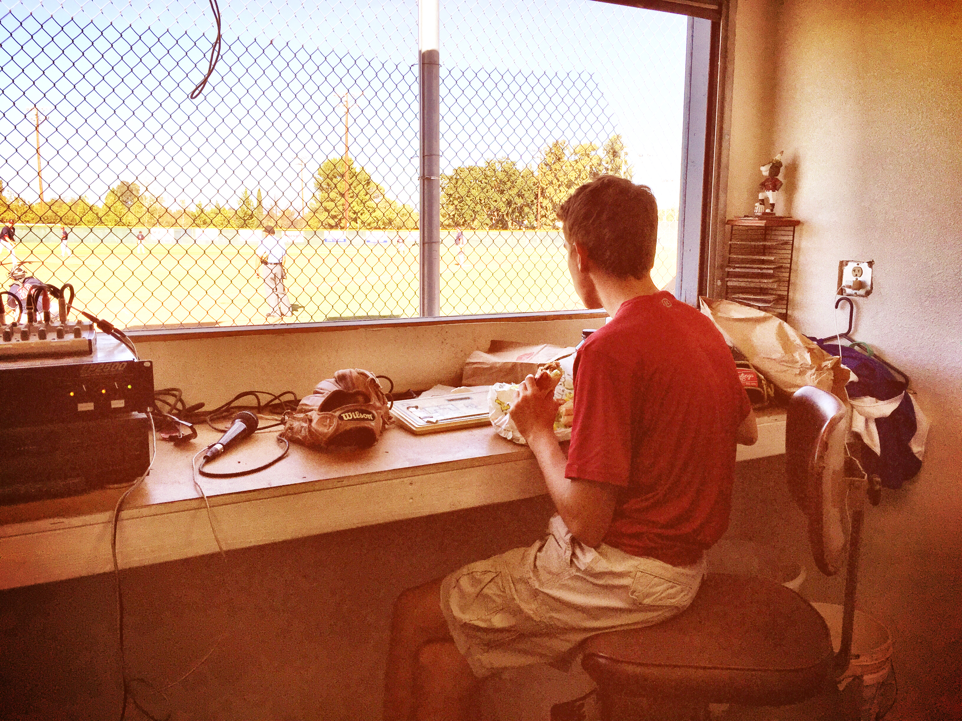 Meanwhile, on a field not too far from here, a low-energy game of over-25s baseball is being played in the 90-degree heat to a very sparse crowd, sitting in small clusters under limited, late-afternoon shade. Alone in the announcer’s booth sits one Peter Frame, running the boards like a boss.