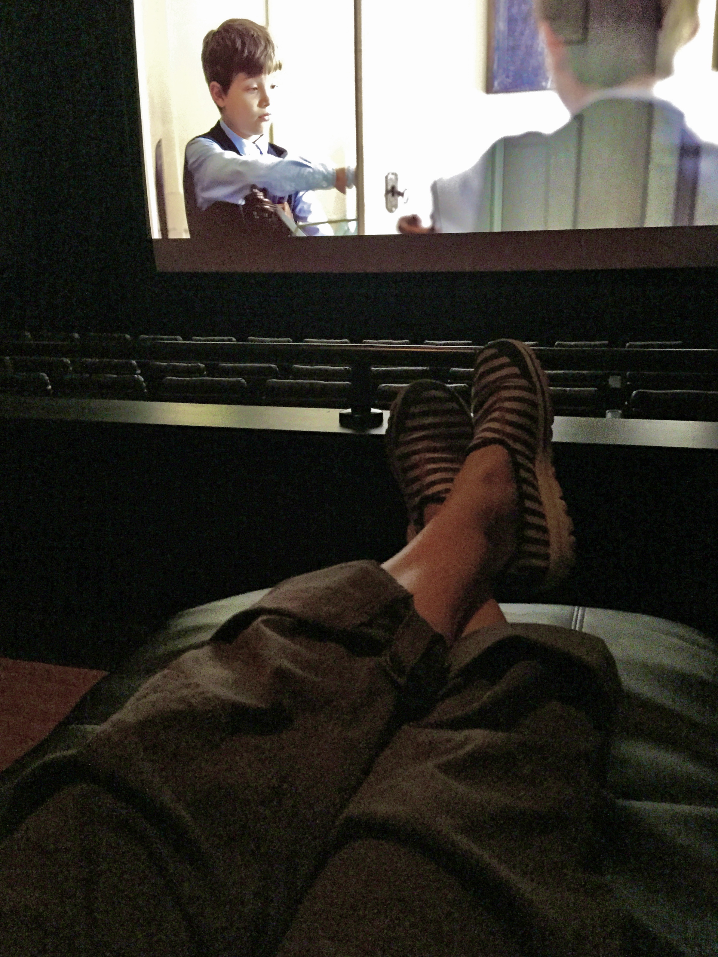 At this theater, for some reason, when you purchase your ticket, you also select a specific seat, and then you have to sit in it. You don’t just wander in and sit wherever you want. I can’t imagine why they do this, but it’s part of the deal. We sat in Row E, seats 1 and 2. It was a very sparsely attended film at 3:00 on a Monday. But there we were. Dutifully reclined In our assigned seats.