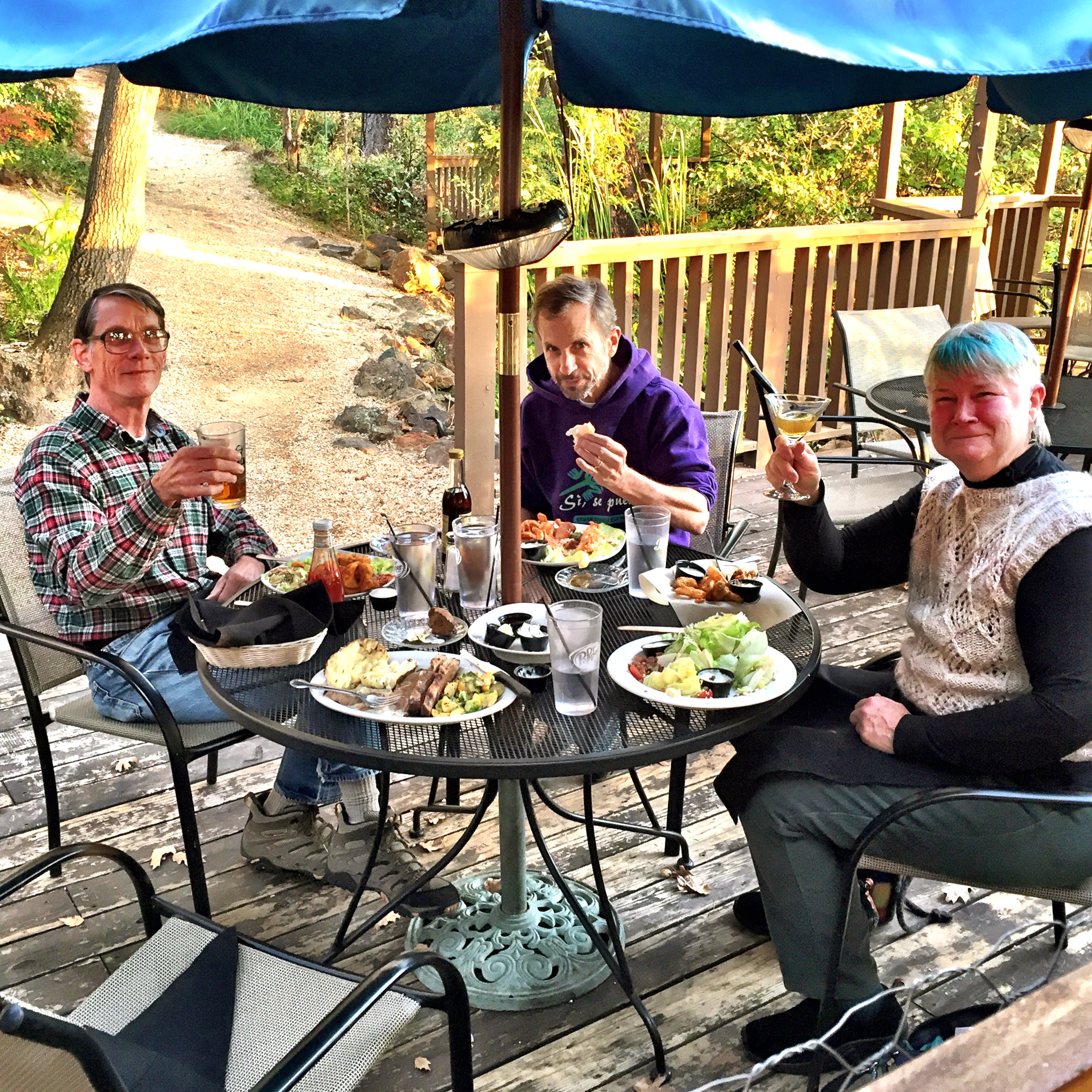 It was just a really fun evening. Started by meeting Susan and Jim for dinner outside of Auburn at that place you see on the billboards: Dingus McGee’s Roadhouse (who knew?). Lovely setting. This is our table out back: