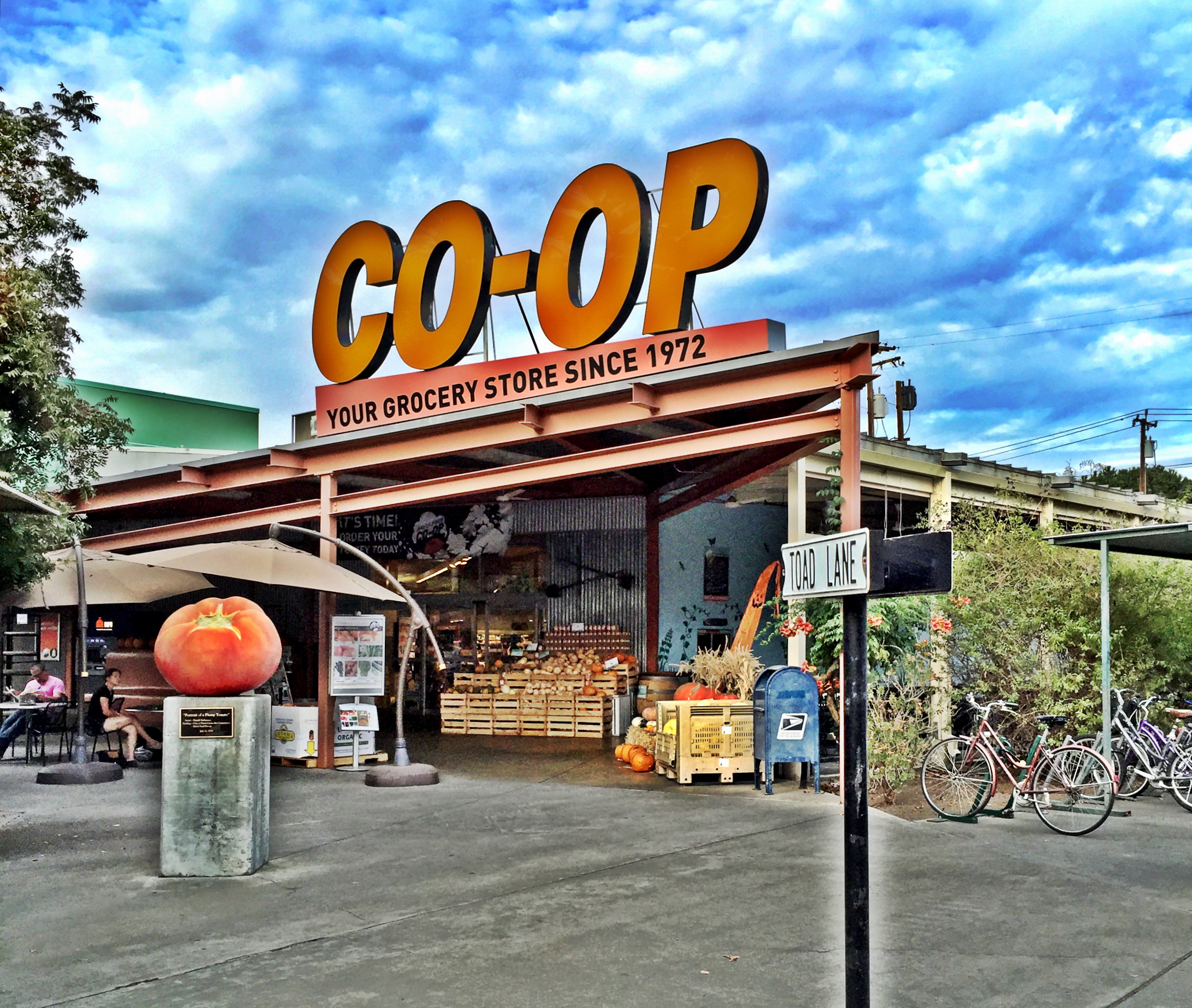 As I do about half the time, I left my bag in my car… so here’s a shot of my cartful of groceries that I’ll transfer to a canvas bag. Mostly it’s a shot of a human scale, garden-filled parking lot, situated in a quiet, tree-lined, downtown neighborhood. If you have to shop….