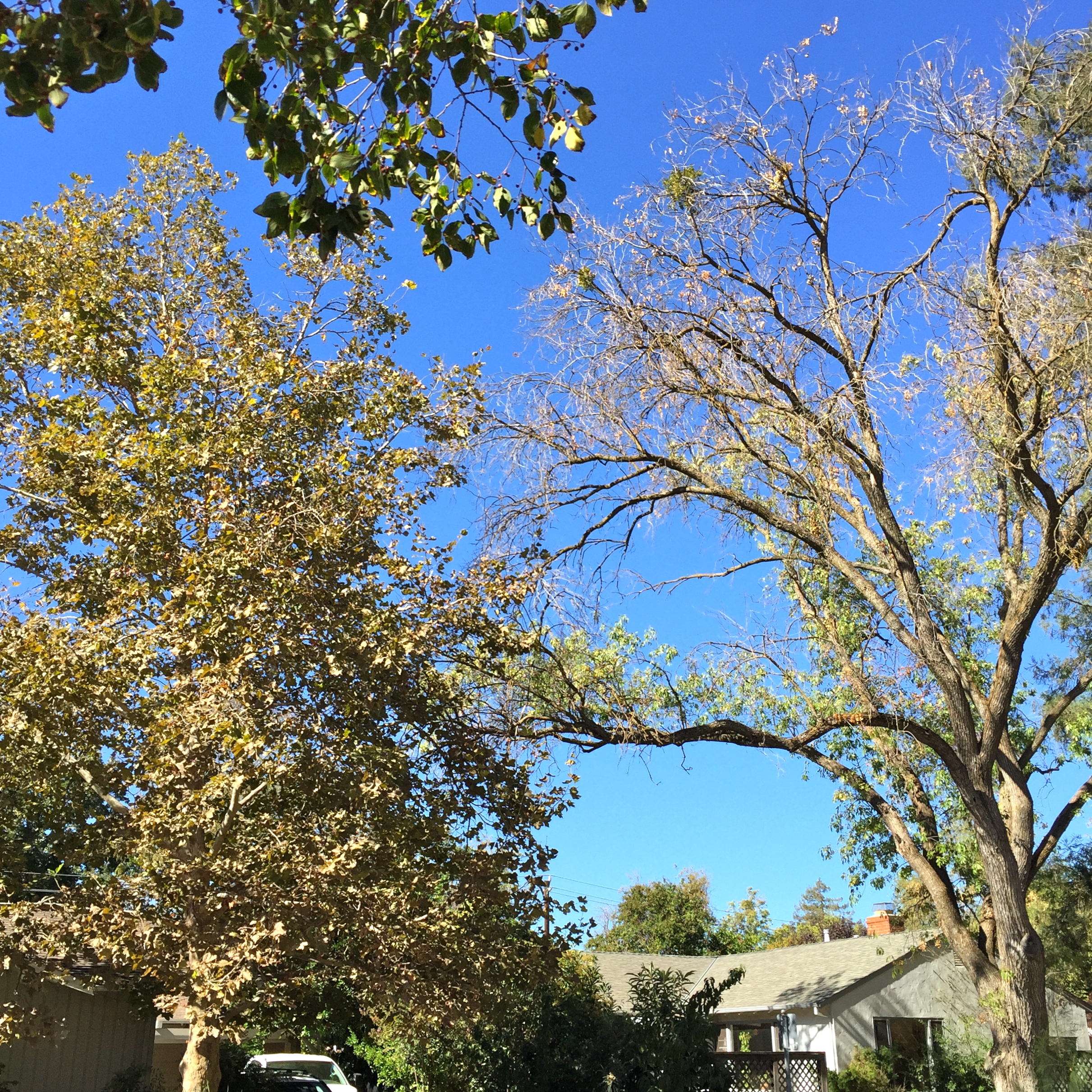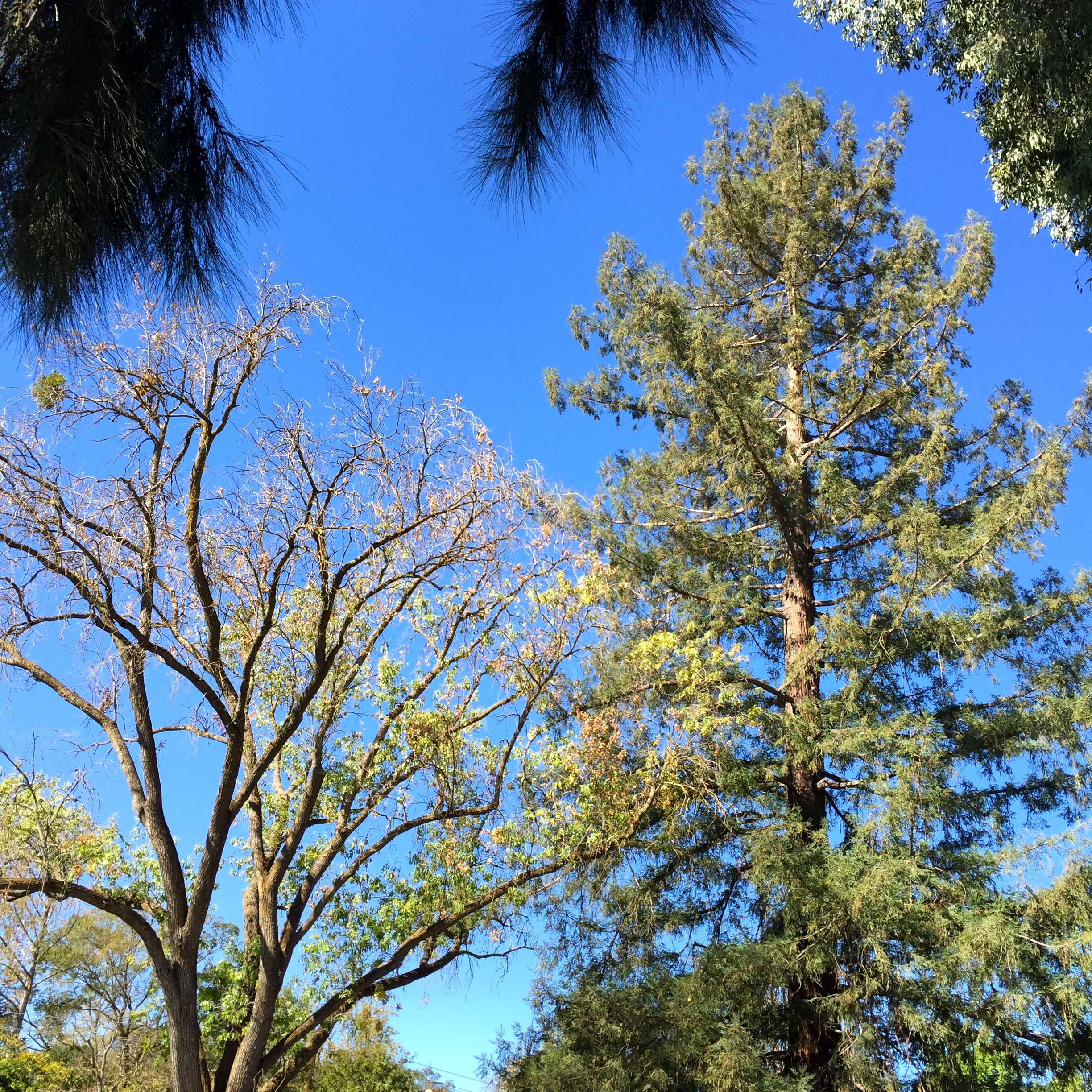 We still have a giant redwood two doors up, just to the north of the ash, to sort of worry about (if you’re me and fear falling trees), but the arborist assures us this one’s solidly rooted. Tall, and within reach of our house, yes, but not a reasonable threat. Medium relaxed about this.