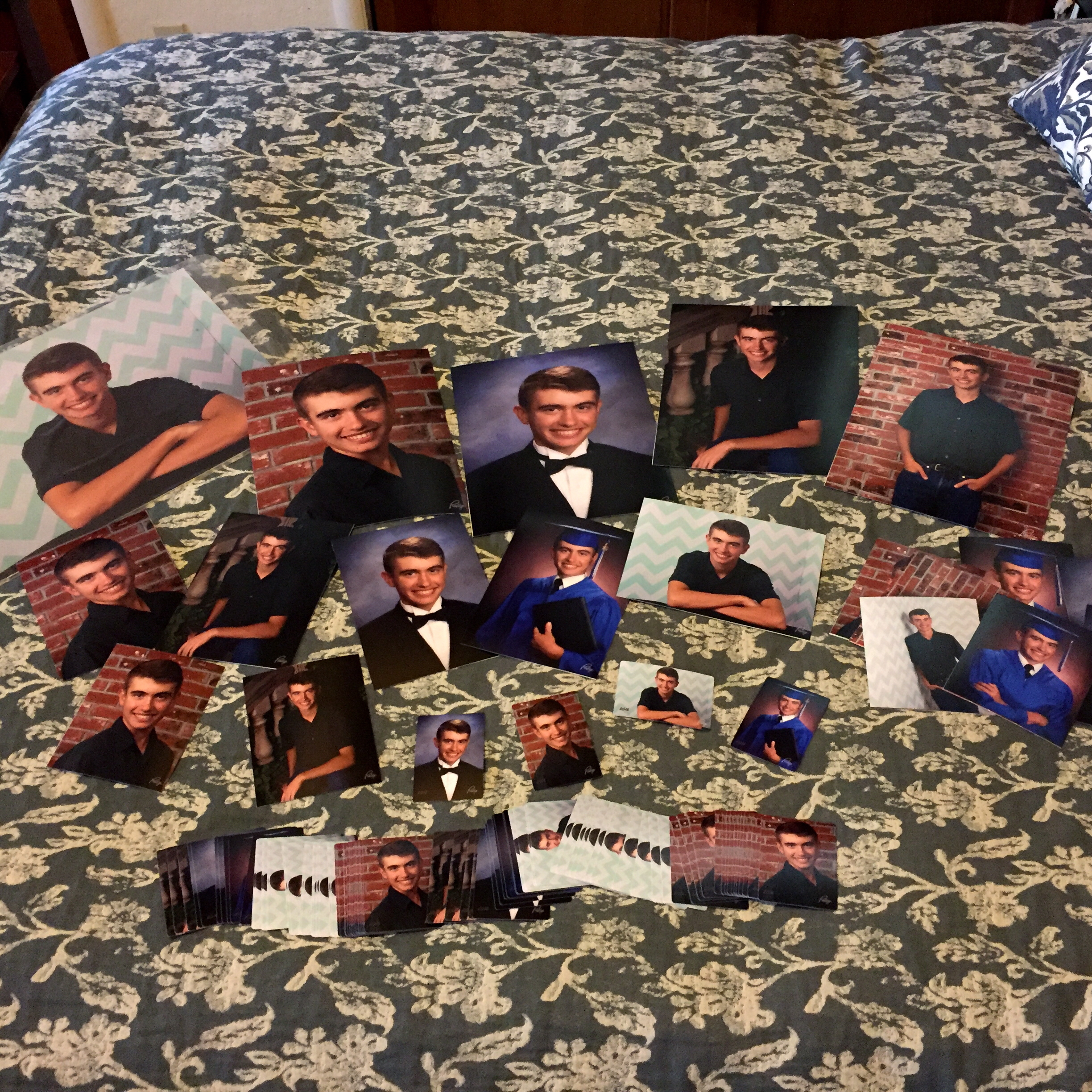 Peter’s senior portraits arrived. We’ve never done formal photos, so thought what the heck. If not now, when? It’s a little insane what you pay for these things… I’ll just say somewhere north of $450. Yes, I’m not kidding. For that, you get 1 11×14, 4 8x10s, 10 5x7s, 12 4x5s, and 88 wallets. Eighty eight. What do you do with those? You also get all kinds of frames and boxes and album thingies, plus a CD.