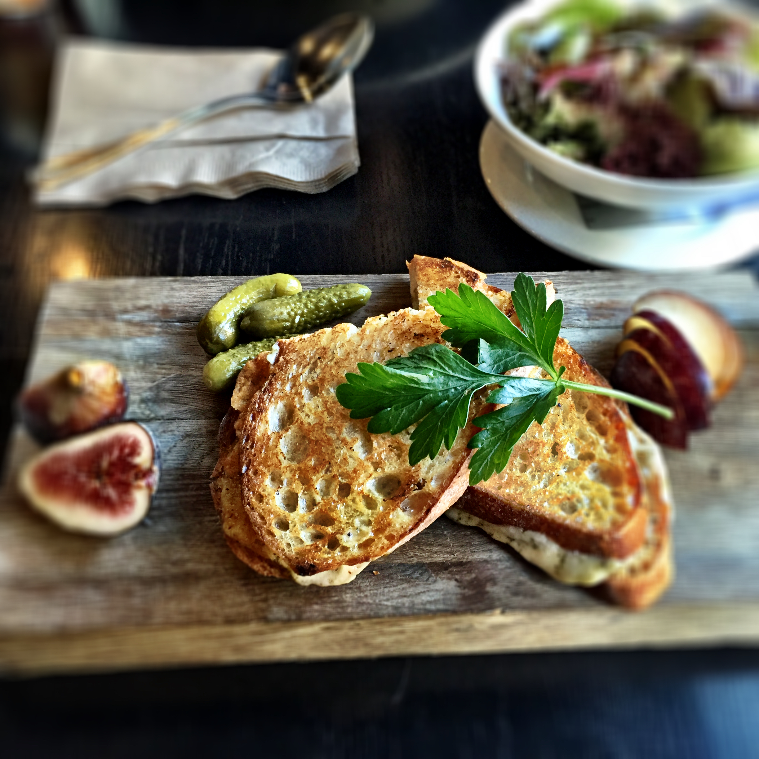 Jim and I had lunch at Magpie’s new location at 16th and P (their cafe/bakery remains at their original spot at R & 14th). Here’s my grilled cheese (with gerkins, fig, pluot served on a wooden cutting board).. a very appealing presentation: