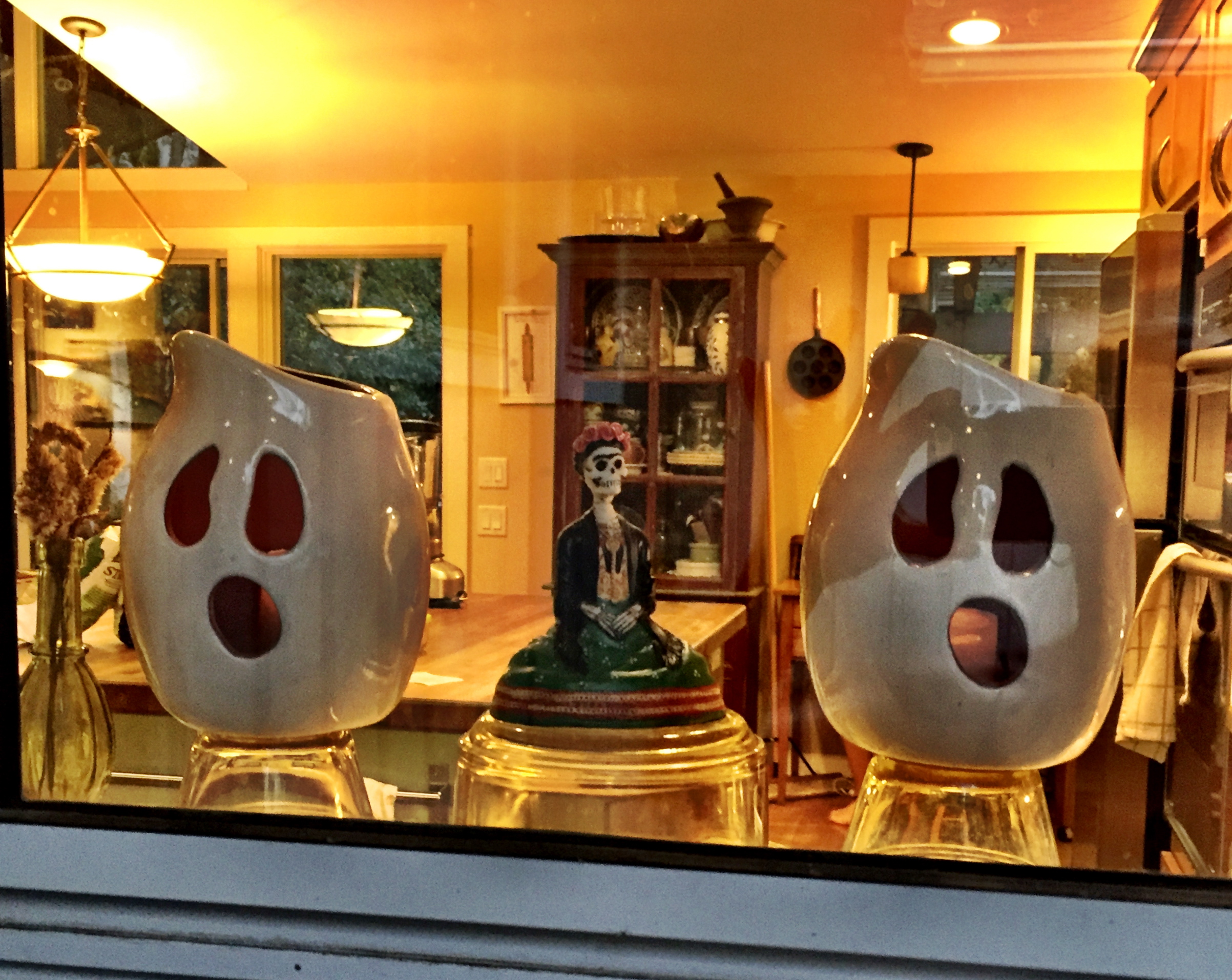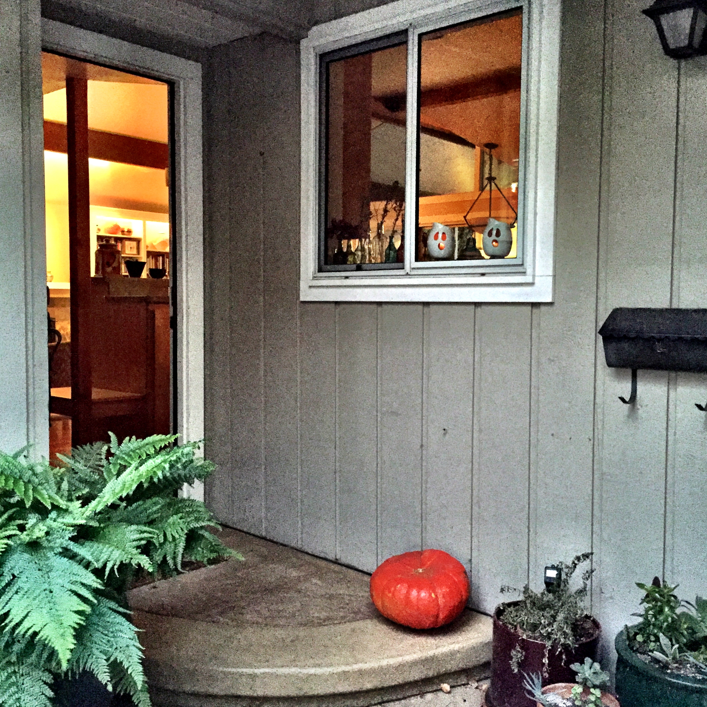 Our house, minorly spooked up (got a great last minute deal on a pumpkin this afternoon–you might remember a shot I took about a week ago of the fall display at the Davis Food Coop?…. this is that flatish pumpkin that was on the far left):