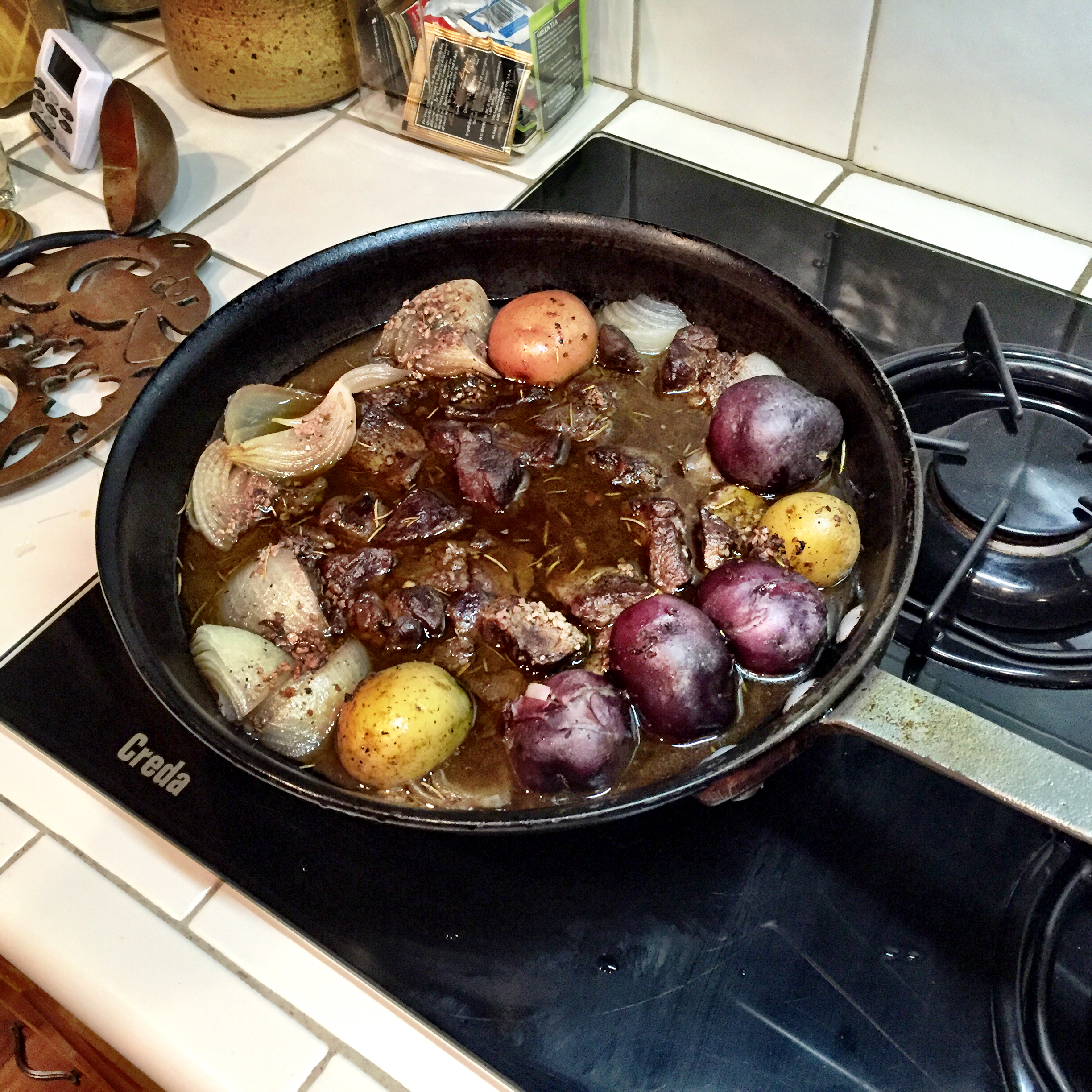 I am not kidding. This was insane… the beef was so tender and so richly, deeply, perfectly spiced–garlic, pepper, herbs, wine, butter. The beef just fell apart, the potatoes were perfect. Jeez gawd. Fantastic.