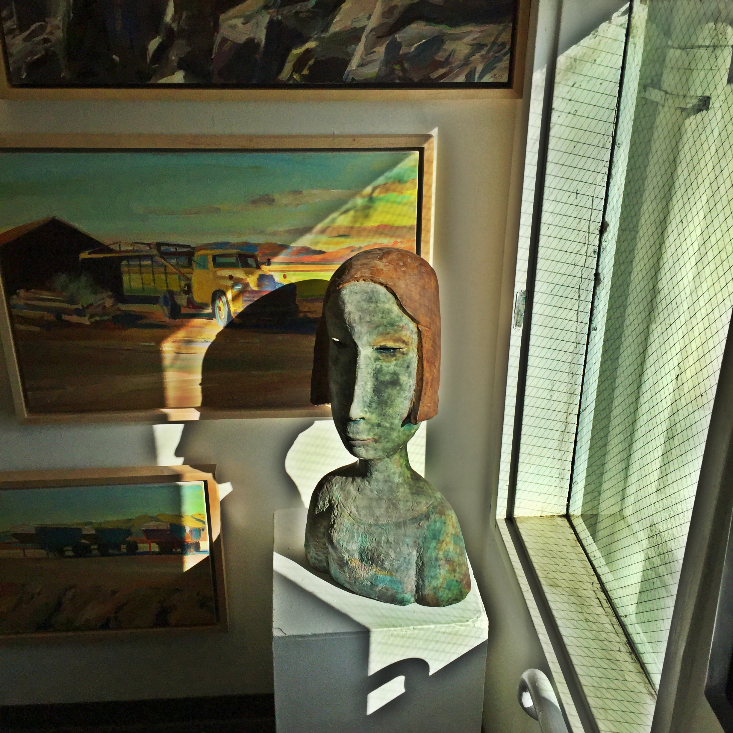 At the Natsoulas gallery, in a stairwell–possibly between the 3rd and 4th floors–an unlabeled sculpture sits crammed among unlabeled paintings in the shadows of late afternoon sun…