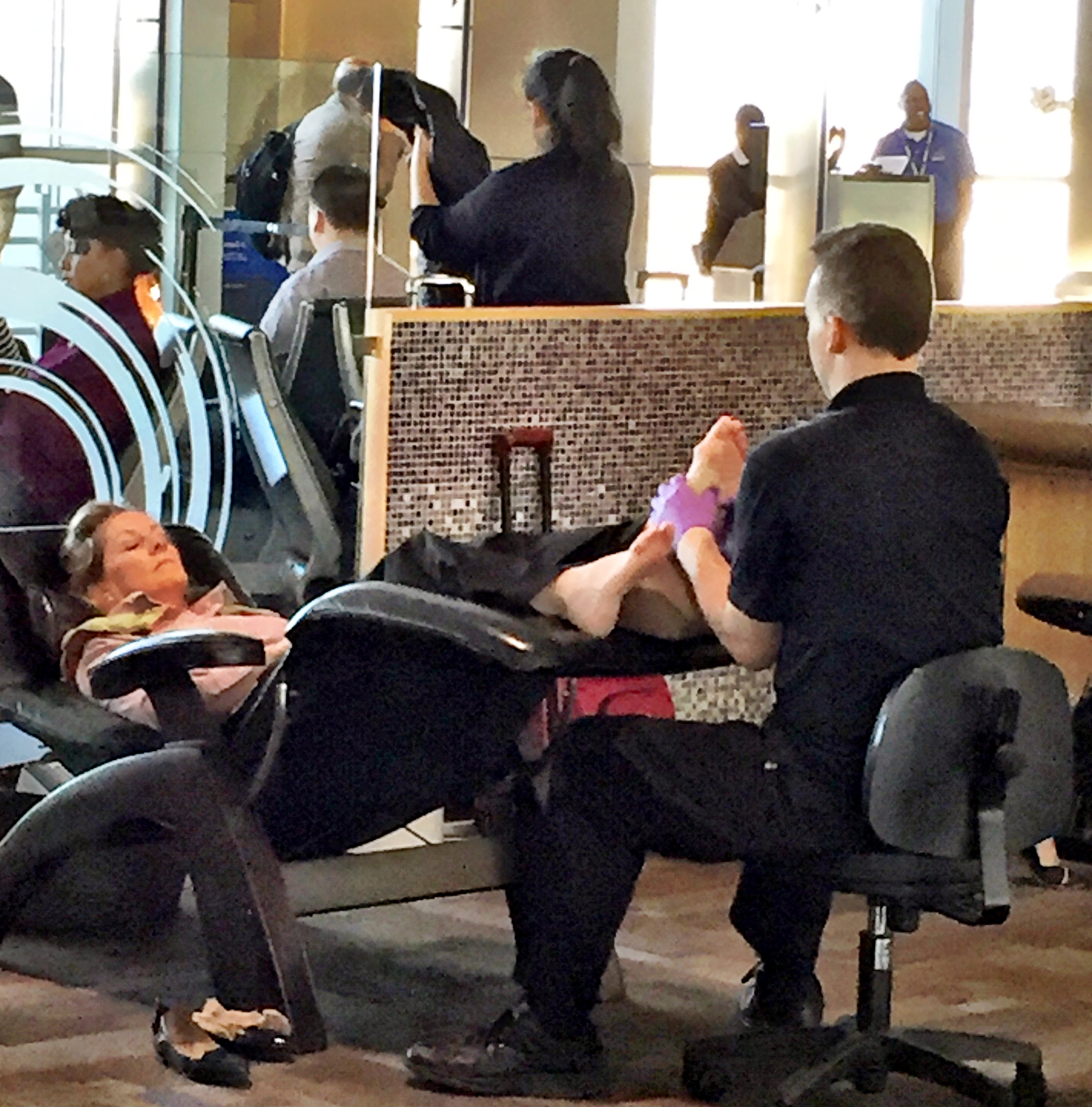 So, first, there’s this. Now, I’m a great enjoyer of regular massages (therapeutic, of course), but I just can’t quite get over this hump. Airport terminal massages… no can do. She, however, has no such hump to overcome and seems to be enjoying the hell out of it.
