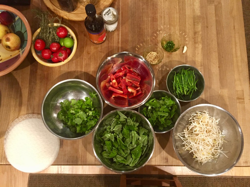 Then prep some: basil, cilantro, mint, bean sprouts, chives and red bell pepper.