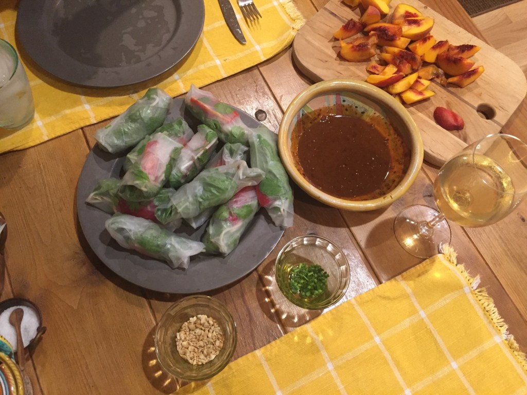 And here’s the whole presentation with that great dipping sauce, chopped peanuts and chopped chives (and peaches and frosty white wine.. because: summer).