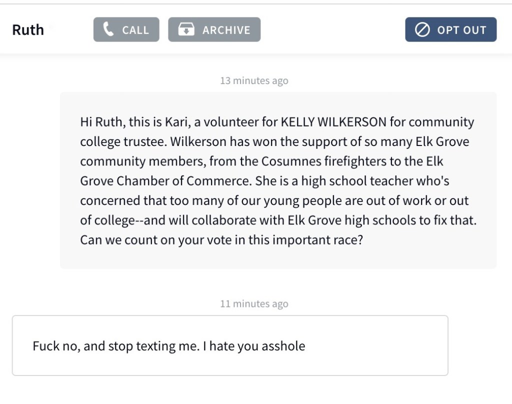 My latest foray into the world of strategic campaign communications was today’s texting effort for Kelly’s Los Rios race. About eight of us were gathered in a Zoom meeting, each independently texting to our own lists, fed to us in batches of 500 from our texting guru herself, Chris. We started the evening texting to voters in Elk Grove (first a group identified as dems, then a group of non-dems). (Just as I left the session, the remaining folks were starting on a list of 11k voters from Davis! Wish I’d had the time to keep going… but it was time for dinner.)