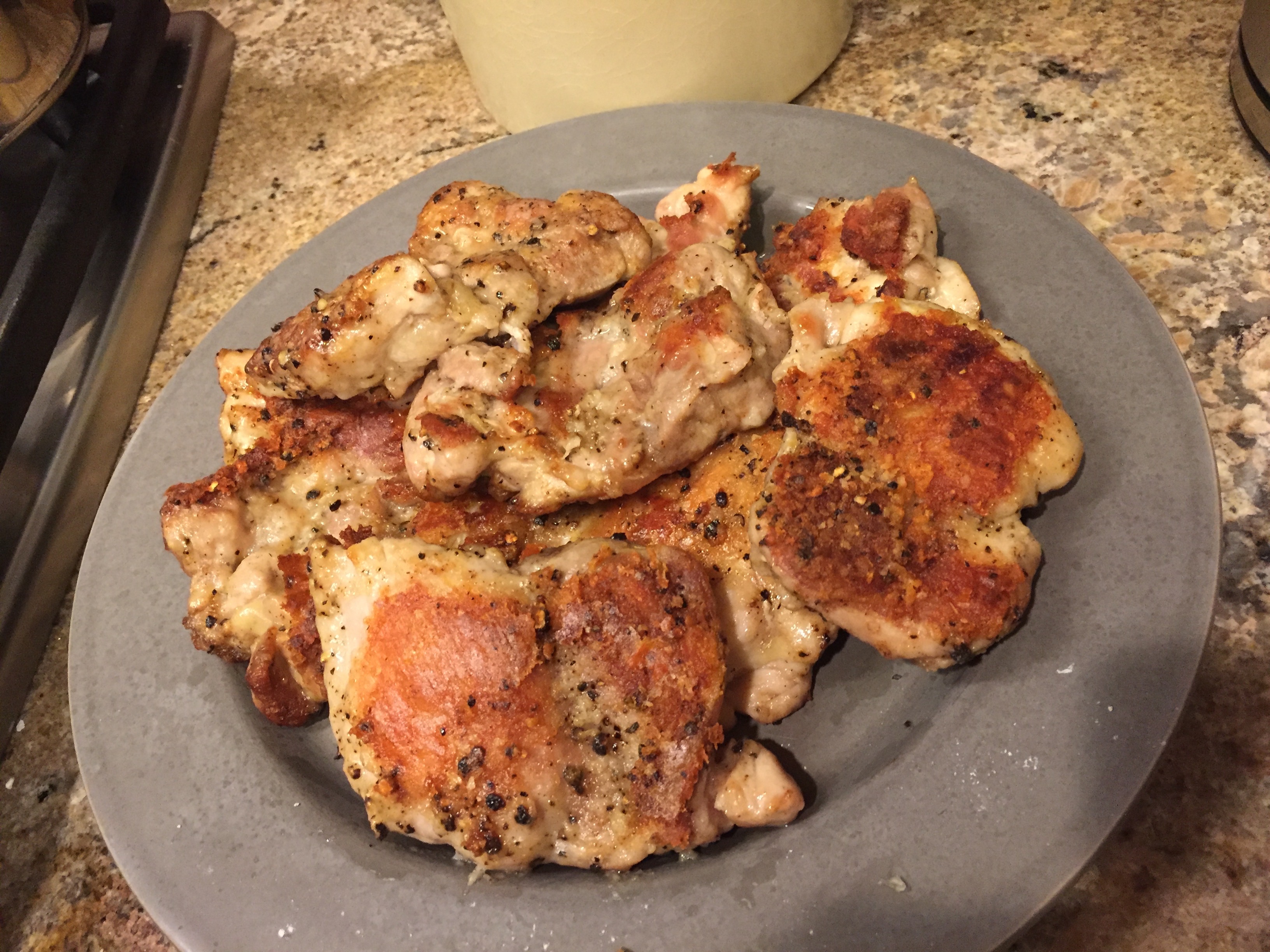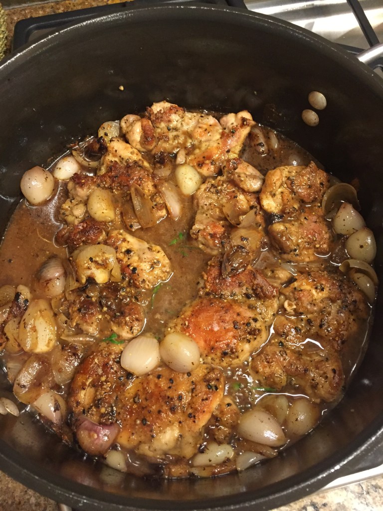 The first step was to deeply brown chicken thighs (which had been sprinkled with flour and a generous amount of salt and pepper) in butter, then remove from pan: