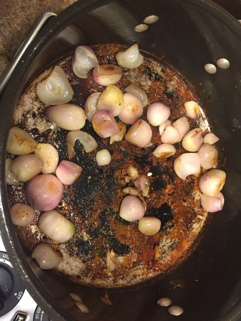 Then, drop whole peeled shallots into that crusted pan and caramelize: