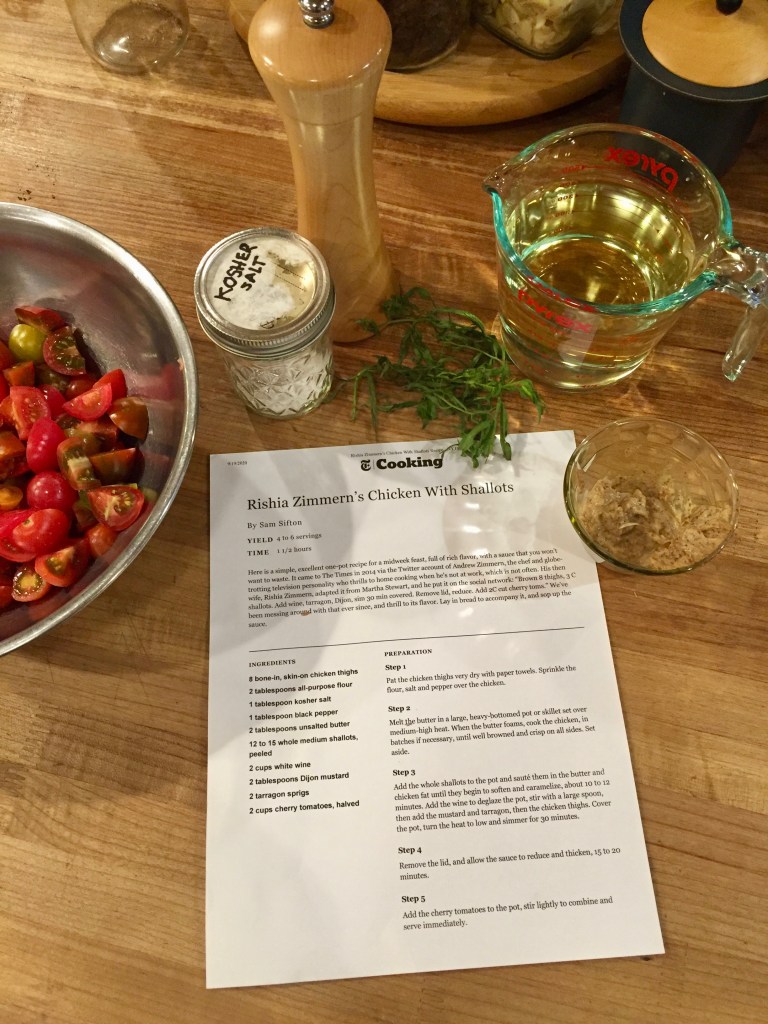 So… chose this recipe.. chicken with shallots. Ingredients include, but are not limited to: halved cherry tomatoes, kosher salt, fresh ground pepp, fresh tarragon, white wine and dijon mustard.