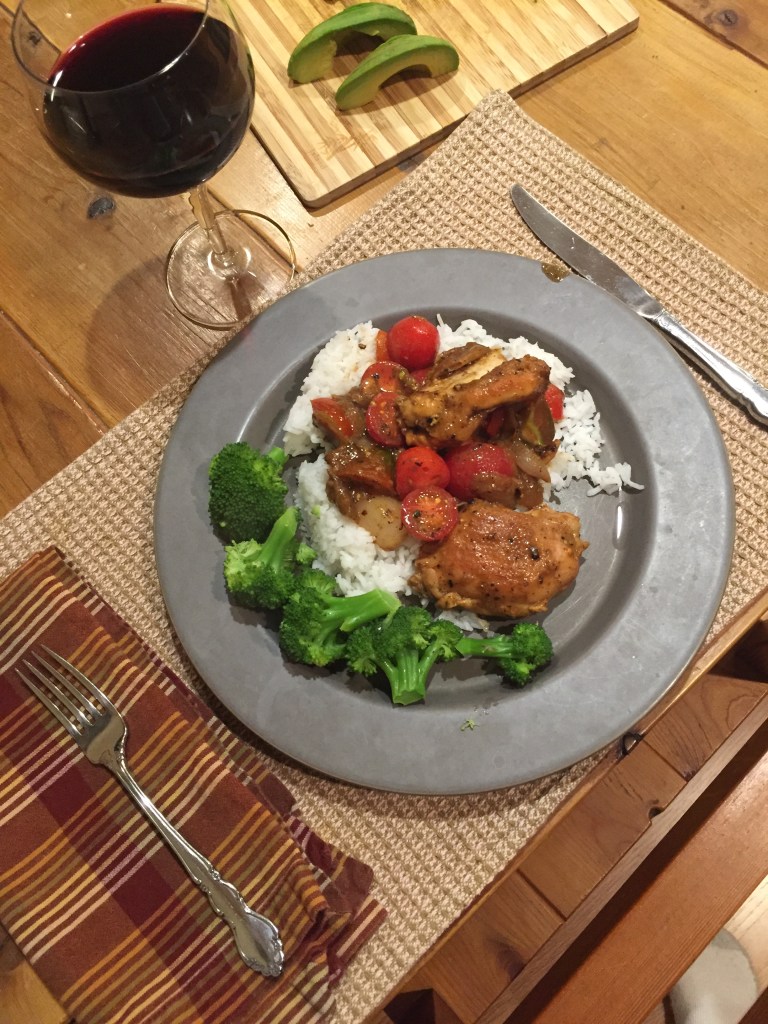After 30 minutes, you uncover and reduce the sauce until it’s thick, but, in fact, it was at its desired thickness already… so I just recovered it, turned off the heat and waited for the rice and broc to be done. When ready to serve, you toss in the halved cherry toms and serve it immediately. It looks like this: