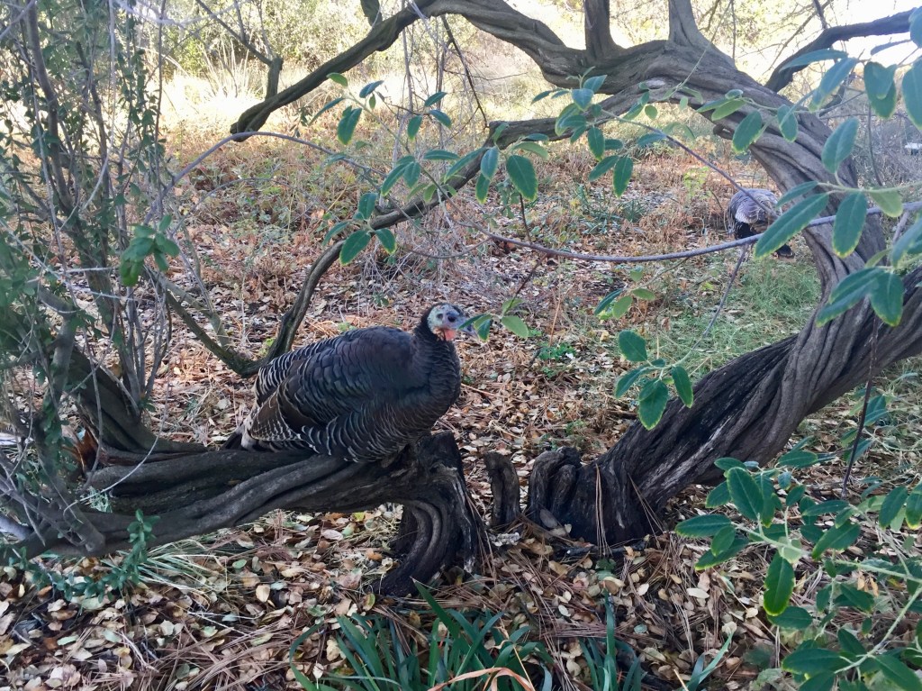 Then there’s the turkey gauntlet we run these days. This rafter seems to have taken up residence at Lake Spafford. We came upon a few on the lake side, a few more in the tree, and others just strutting around underfoot