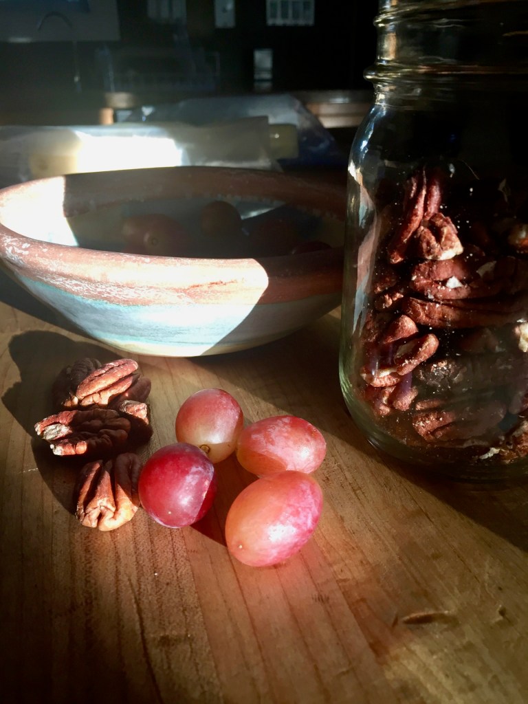 Okay.. more food. Here’s a pic I took this afternoon as I assumed my position at the island eating my usual assortment of snacky things. A sunbeam caught my grapes and roasted pecans in a nice light.. made for an appealing sight:
