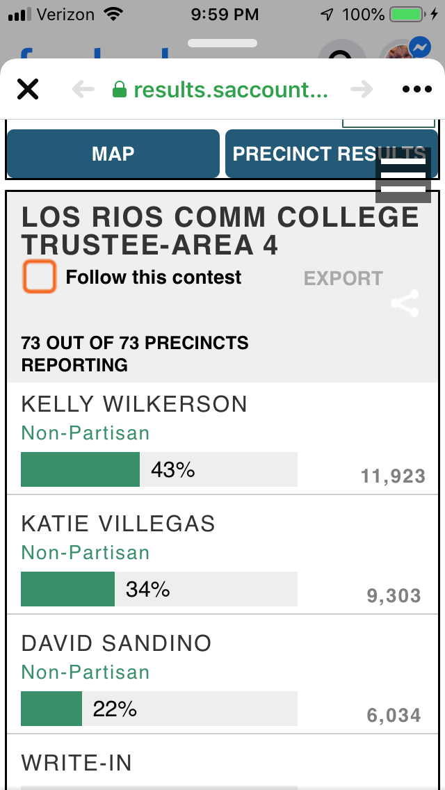 One of the good things that happened last night was Kelly’s race: she won! This is a screen shot of her phone, and represents the results from Sac County. Her race encompasses both Sac and Yolo County, so this is not the whole picture, but it was fun to see how Sac County voted