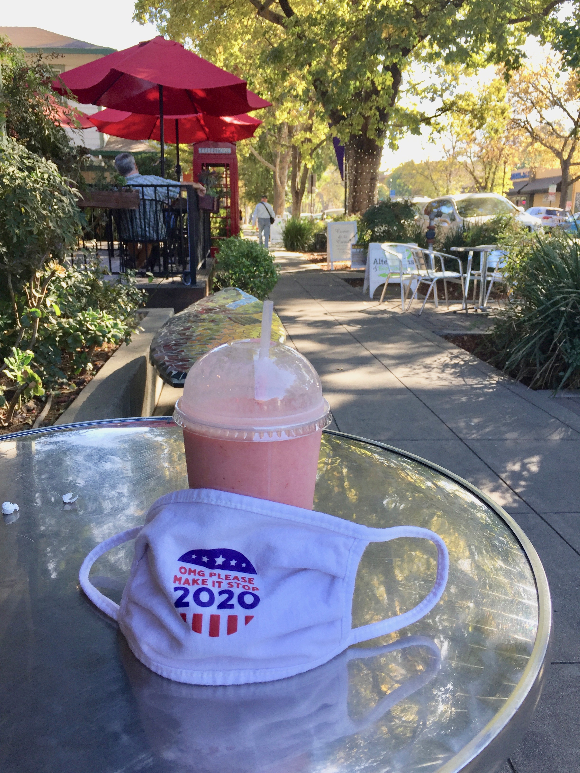 And finally… as I felt a lot more relaxed today, allowing myself to believe that Biden might actually win this thing.. he at least has the momentum. I walked downtown, on a 70 degree sunny fall day (they’ve all been like this for weeks), listening to music. I am so fragile, a sunny day and music made me cry. Here’s me, sitting at Cloud Forest.
