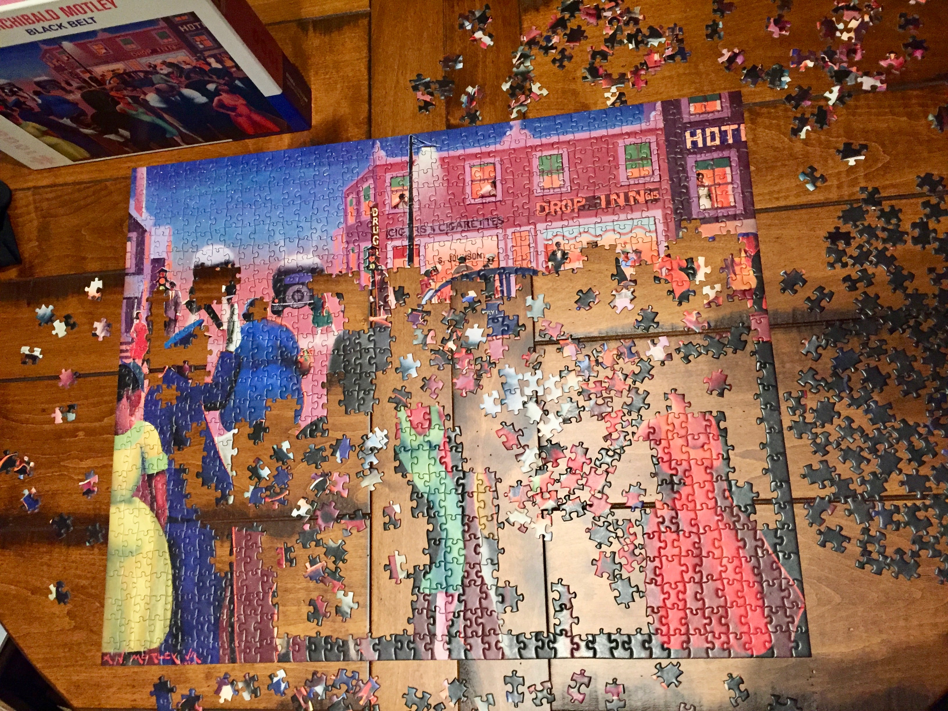 My head’s been mush for the last week. I’d OD’d on election returns and did precious little else most days… a little cooking, walks, some cafe time.. but that’s about it. That did give me some time for this jigsaw puzzle. I’d started it while phonebanking some weeks ago, but had had a hard time getting much done, as the phone kept getting answered (imagine that).