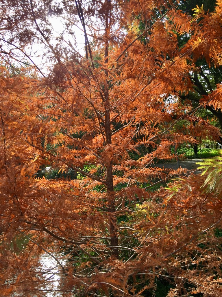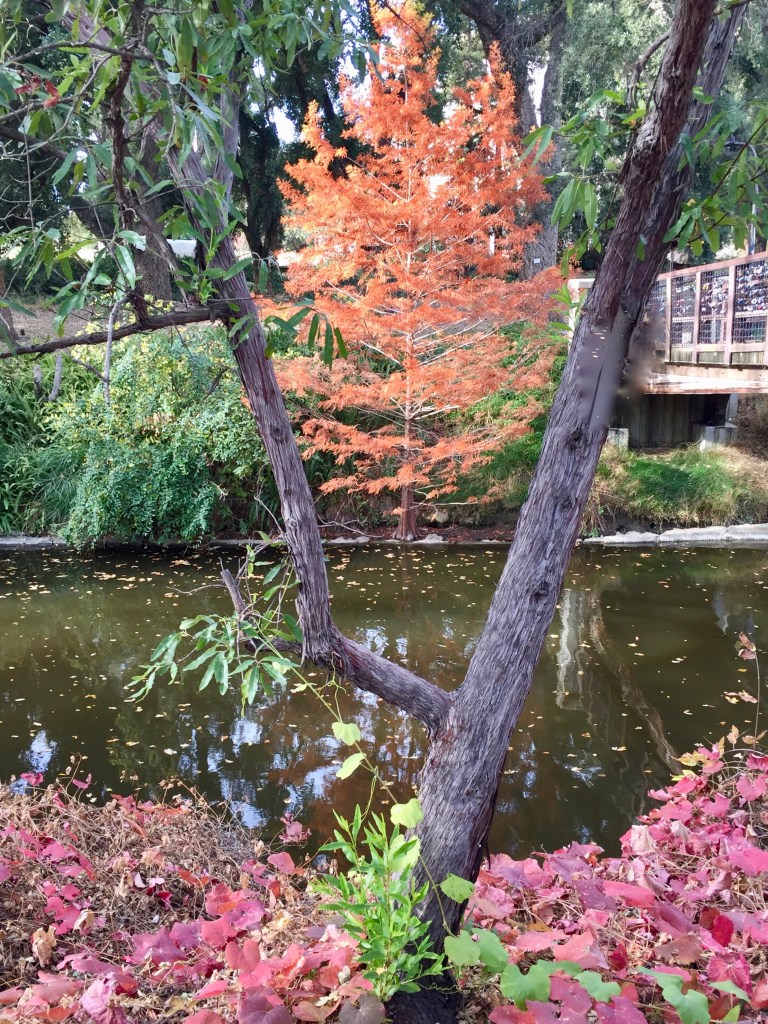 Somebody said something about that tree being a redwood, one whose needles turn orange in the fall. I’ll have to investigate this. Here it is a little closer, taken from the bridge (I’ve taken numerous photos of this tree all season).