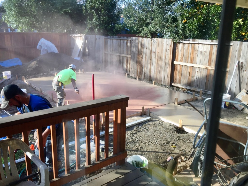 And, in the backyard, Stuart and his crew poured cappuccino colored concrete, then highlighted it with some sunbaked clay. That highlighting happens with a powder that they scatter over the wet concrete.