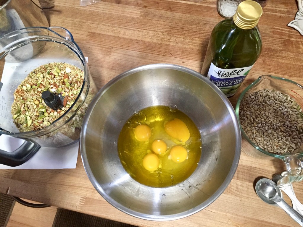 Add those to 5 eggs, 1 1/2 tsp of salt, and 1/3 c olive oil:
