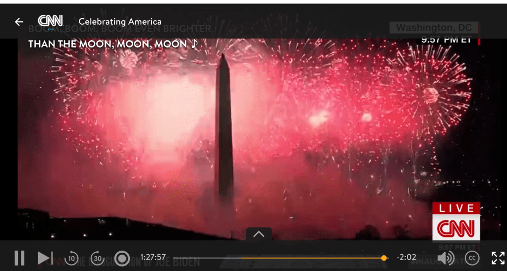 Because of the pandemic, no Inaugural balls. But far more egalitarian — a celebration we could all join — the Inauguration Celebration Concert thingie.. a little hit and miss, but a worthy production! And the whole event concluded with a firework display that I just could barely believe.. it was so huge and stunning and seemed to take place all over Washington, DC. Absolutely breathtaking.