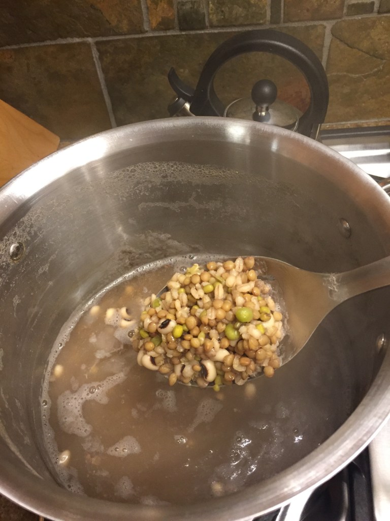 …. then got added to this (a dry mix of barley, lentils, black eyed peas and some other stuff that boiled in water for a while to soften up and was then drained)…