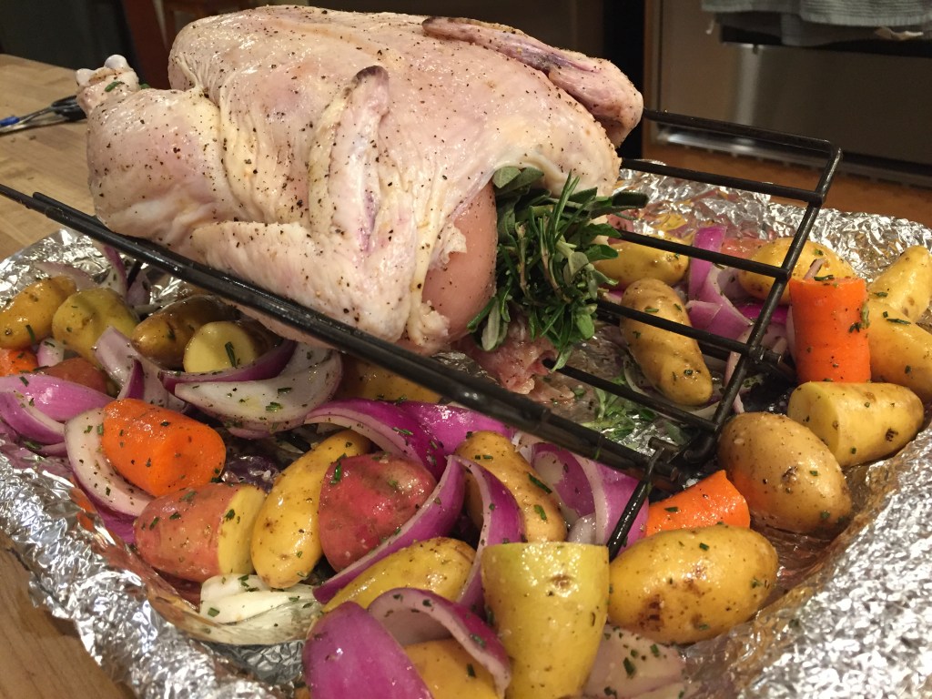 Kind of a kitchen standard… the roasted whole chicken. Messy as all get out…even if you put down layers of tin foil. The foil works for making the roasting pan easy to clean, but the rack is hell and the chicken carving always turns into a huge messy mess. Still… a good dinner standby.