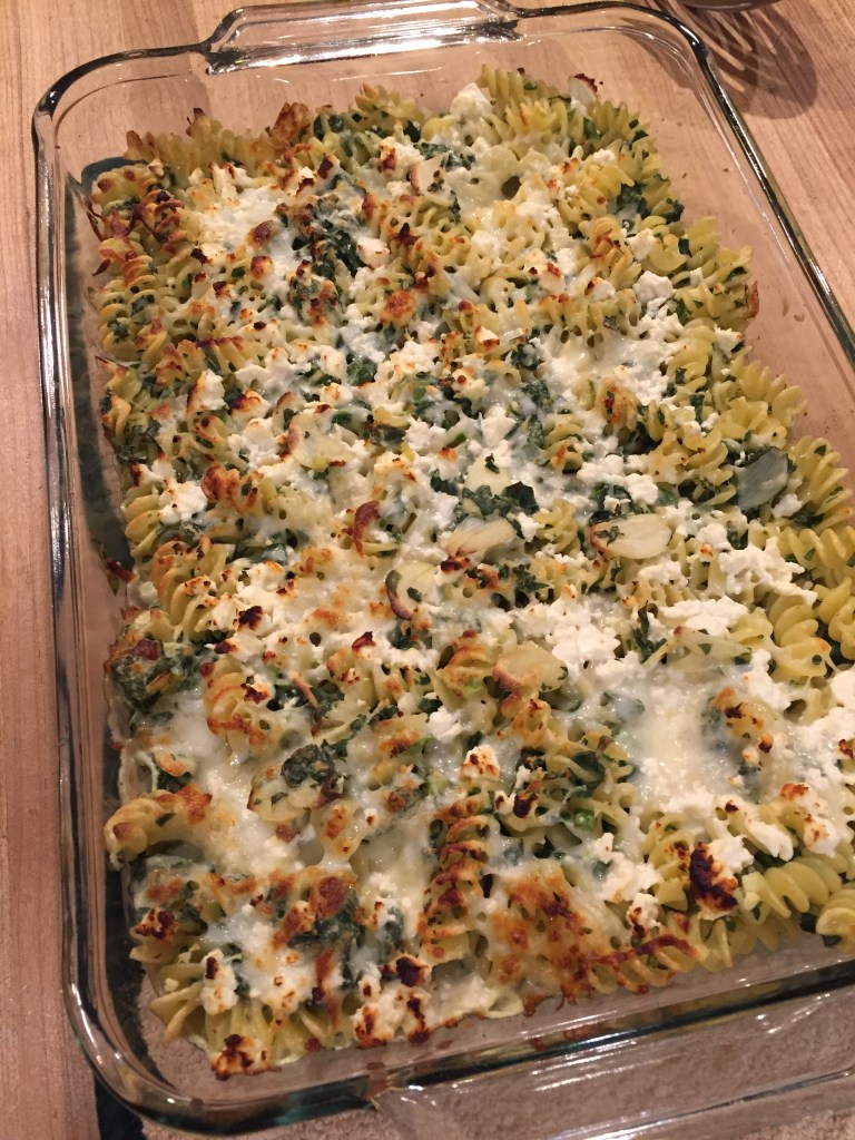 It’s a spanokopita-inspired dish. You mix great piles of chopped spinach, arugula, parsley and scallion greens with some salt and pepper, and set aside. Then you prepare the fusilli until a couple minutes shy of al dente, and set that aside. Then you saute in butter some thinly sliced garlic and chopped scallion whites, add cream cheese and a cup of your pasta water, mixing til creamy. You then add the greens, the pasta, grated mozzarella and crumbled feta. (Did I mention this is insanely rich?) Once all this is transferred to a baking dish, you sprinkle the top with more mozzarella and feta and bake until brown. The best bites are those that are crunchy. So so good.