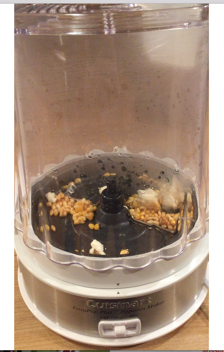 A long time ago, we got a popcorn popper from Matty and Michael, which we somehow forgot about (our loss!). Since it was the first time using it, we followed the directions to the letter. We used only 1/3 cup of kernels — which they indicated would yield 8 cups of popped corn — yet got nowhere near that.