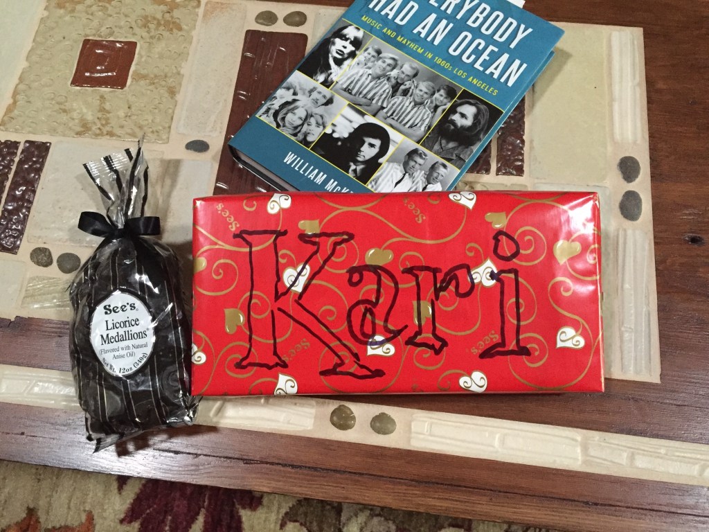 To wit… Sees candy and licorice for me, a book on music and mayhem in the 60s for Jim. See how easy that is?