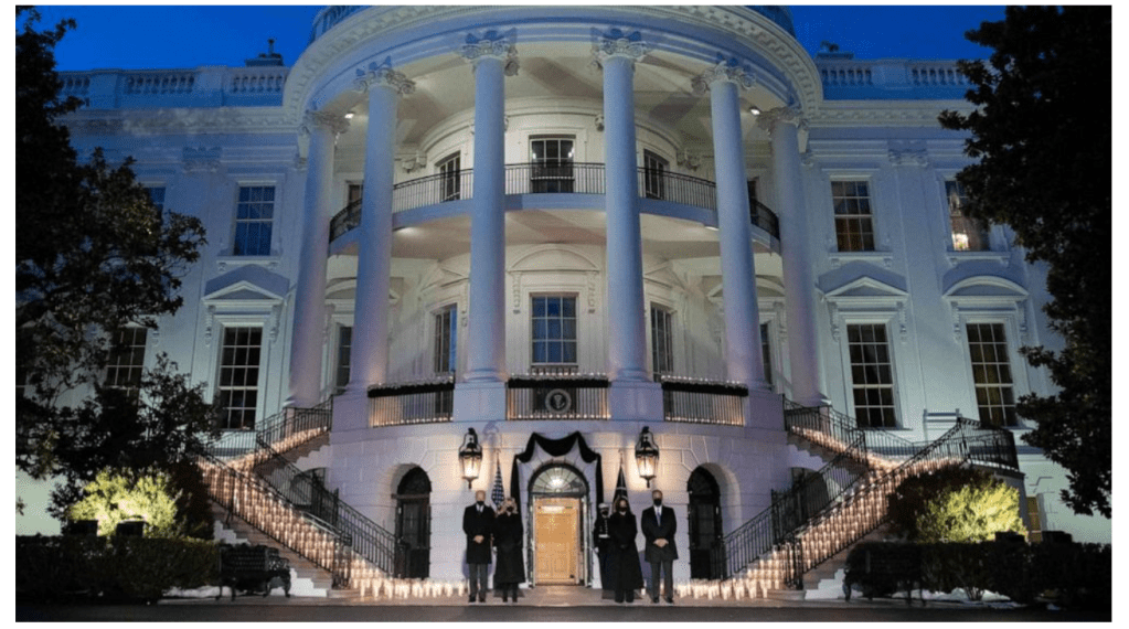 We are now so much better off than we were a month ago. We can all breathe again. We have a human being in the White House who actually cares about the welfare of our nation and the people in it. Who sees his role as compassionate protector, fierce defender, moral leader. He spoke to the nation tonight — a moving address — while standing in front of the “People’s House.” Five hundred candles arrayed on the steps, each representing a thousand lives. Wow.