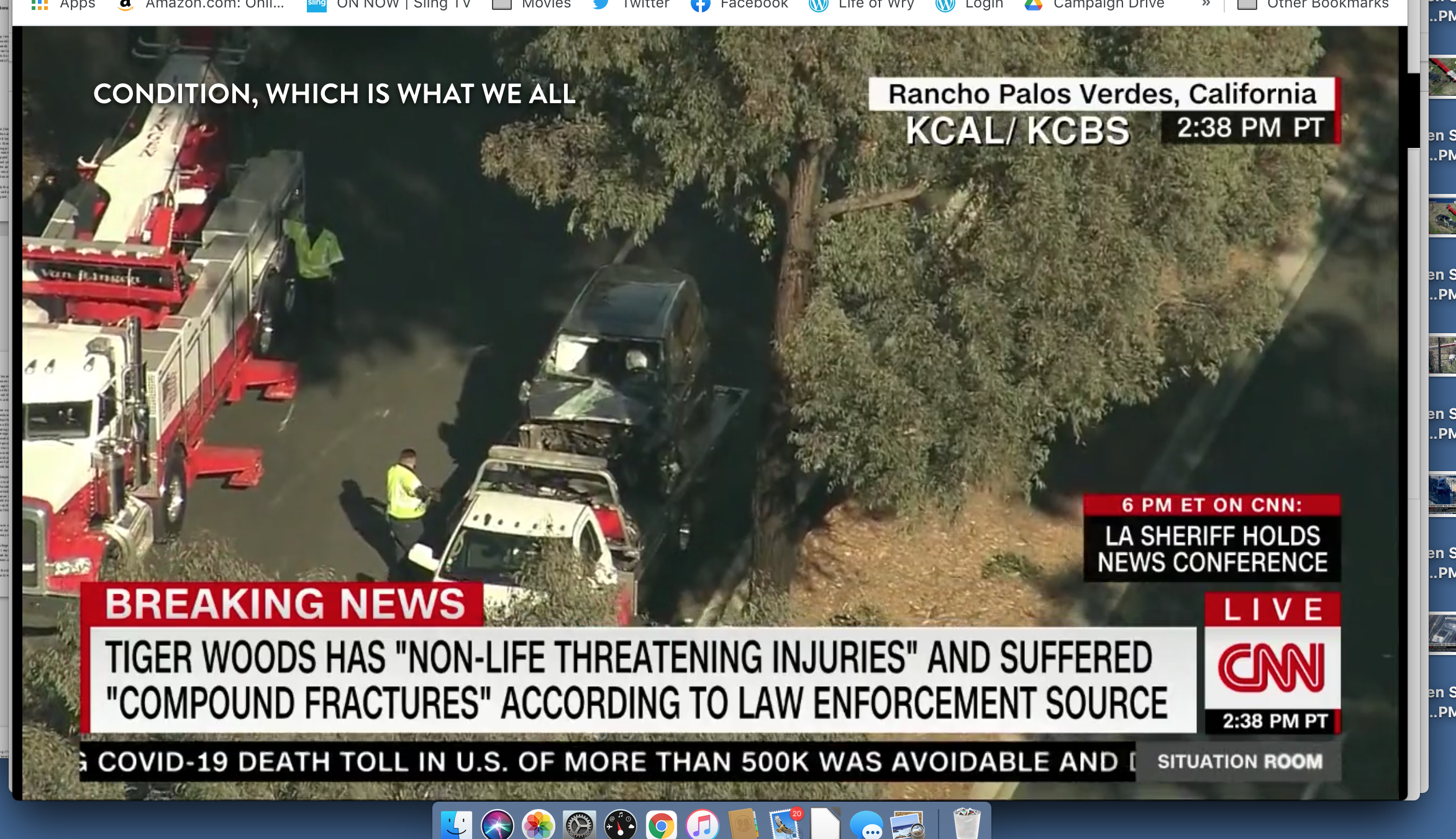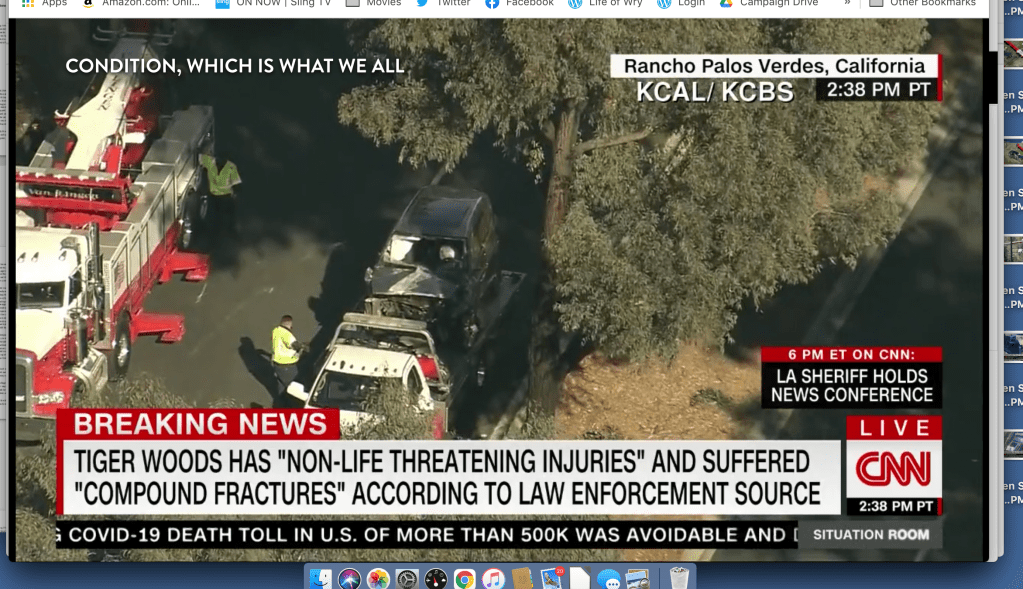 The good news: Tiger Woods will be okay. The spectacular single-car accident this morning in which his car rolled and rolled and rolled (and yes, landed in the woods, on the side of a cliff), and resulted (so far) in numerous compound fractures to his legs, did not kill him. He’s alive and will live to see his two young kiddos grow up (if nothing else bad happens).