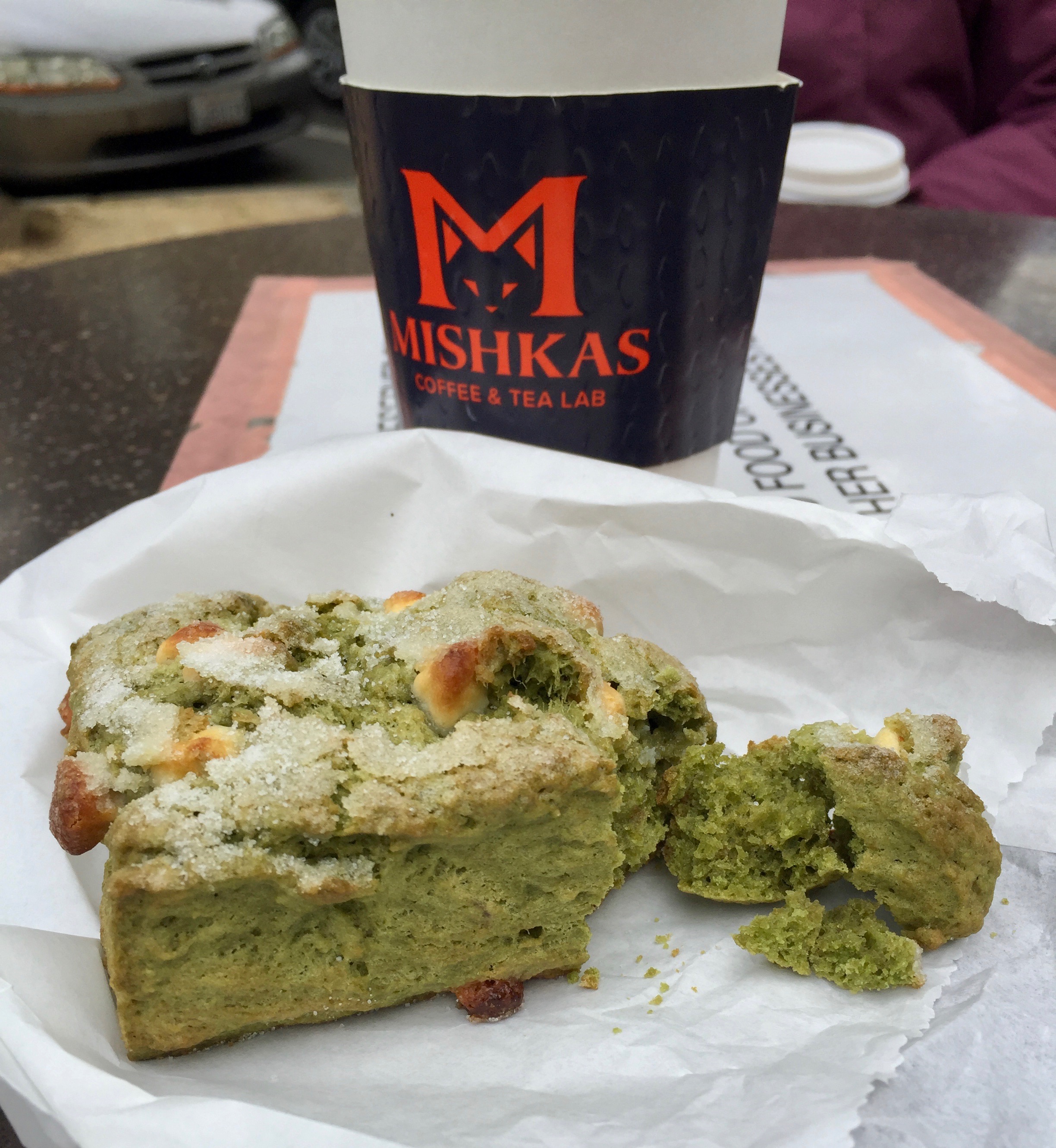 A most pleasant coffee and scone this morning with Vicki… on this, St. Patrick’s Day. (That would be a mocha, white chocolate, almond scone, I believe.. but all I tasted was green.)