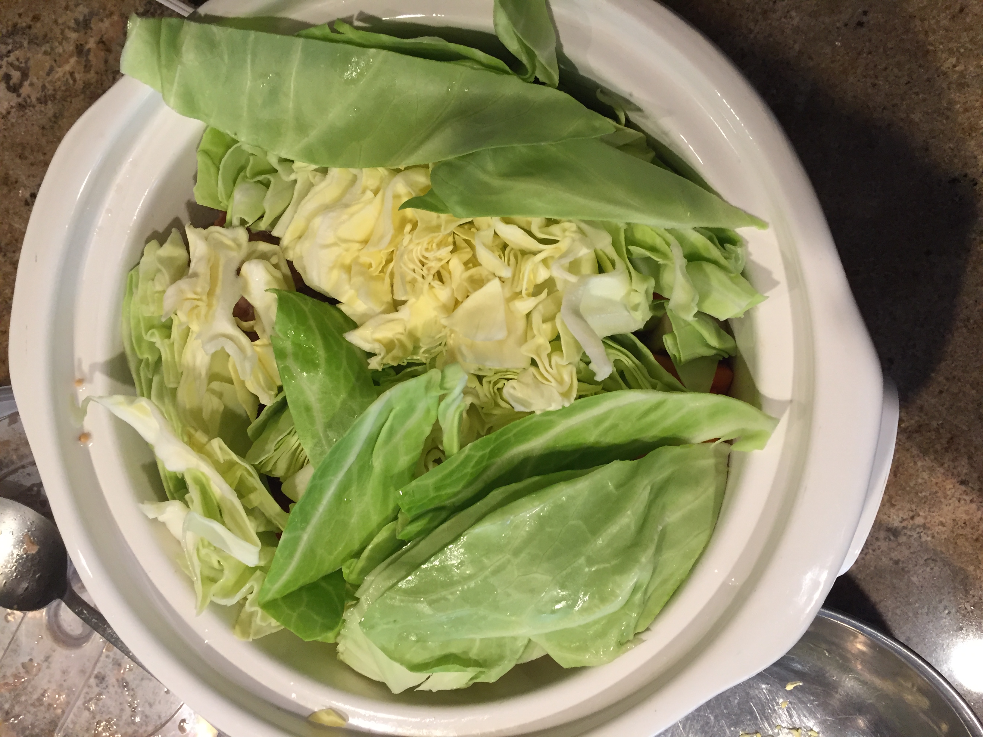 At the four hour point, added potatoes, carrots and cabbage: