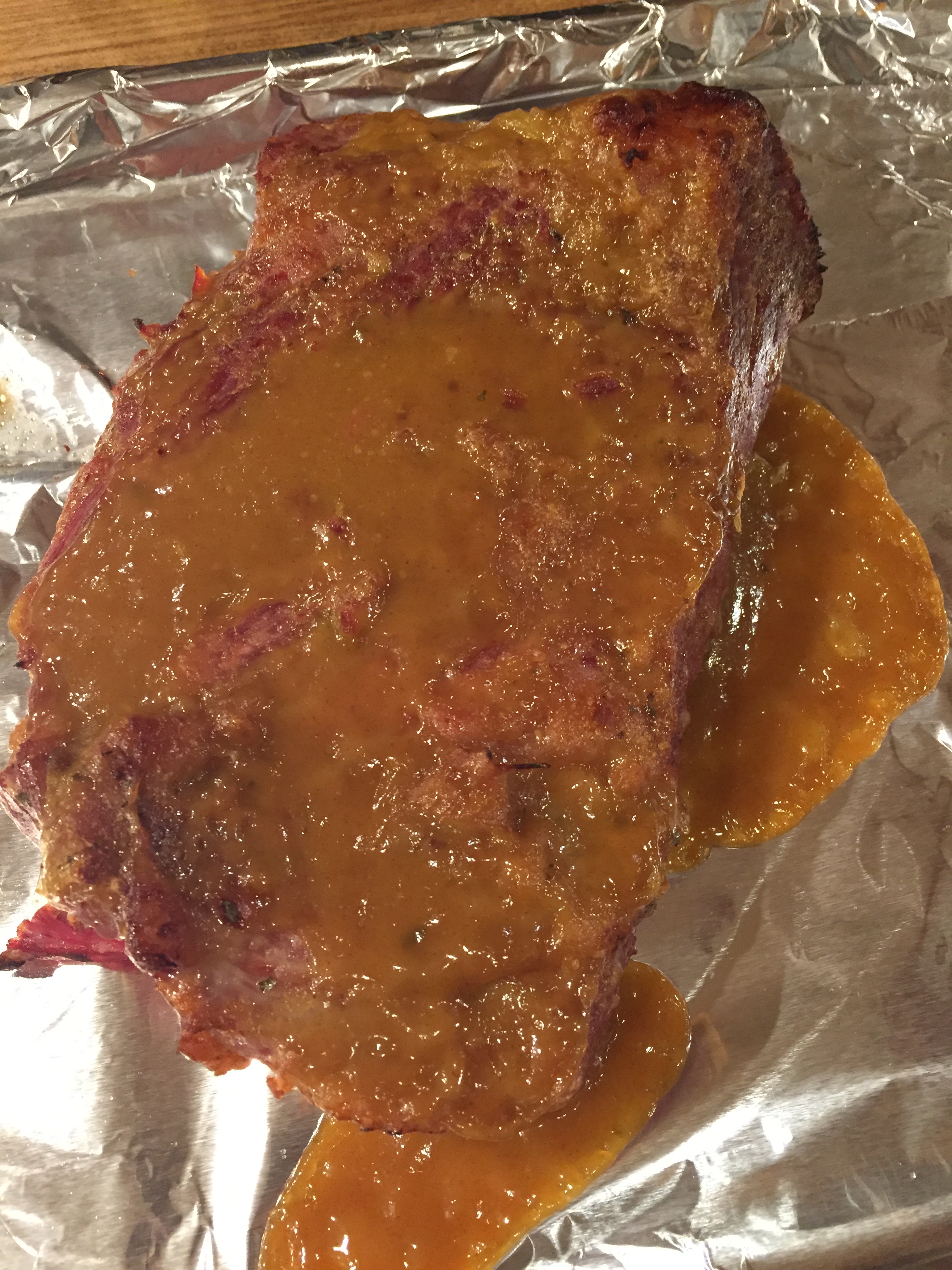Three hours later (after a mix of high and low settings), slathered it in a mustard and honey mixture and put it under the broiler for 5 minutes or so until it bubbled and caramelized.