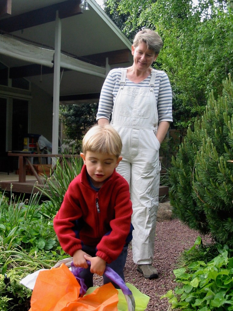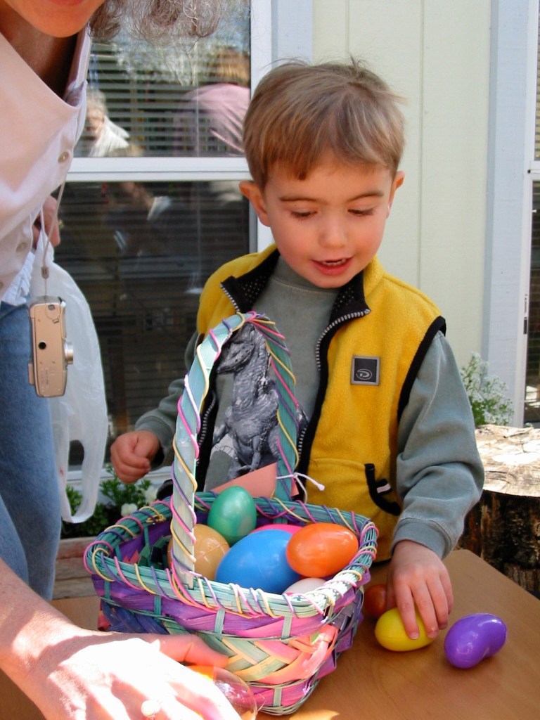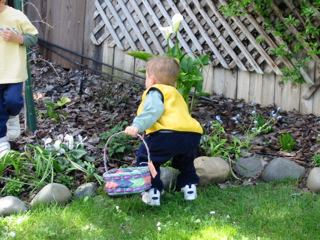 So, here’s Easter 2002 (Peter now 3 yrs old)… from the clothing, it looks like three different egg hunts.