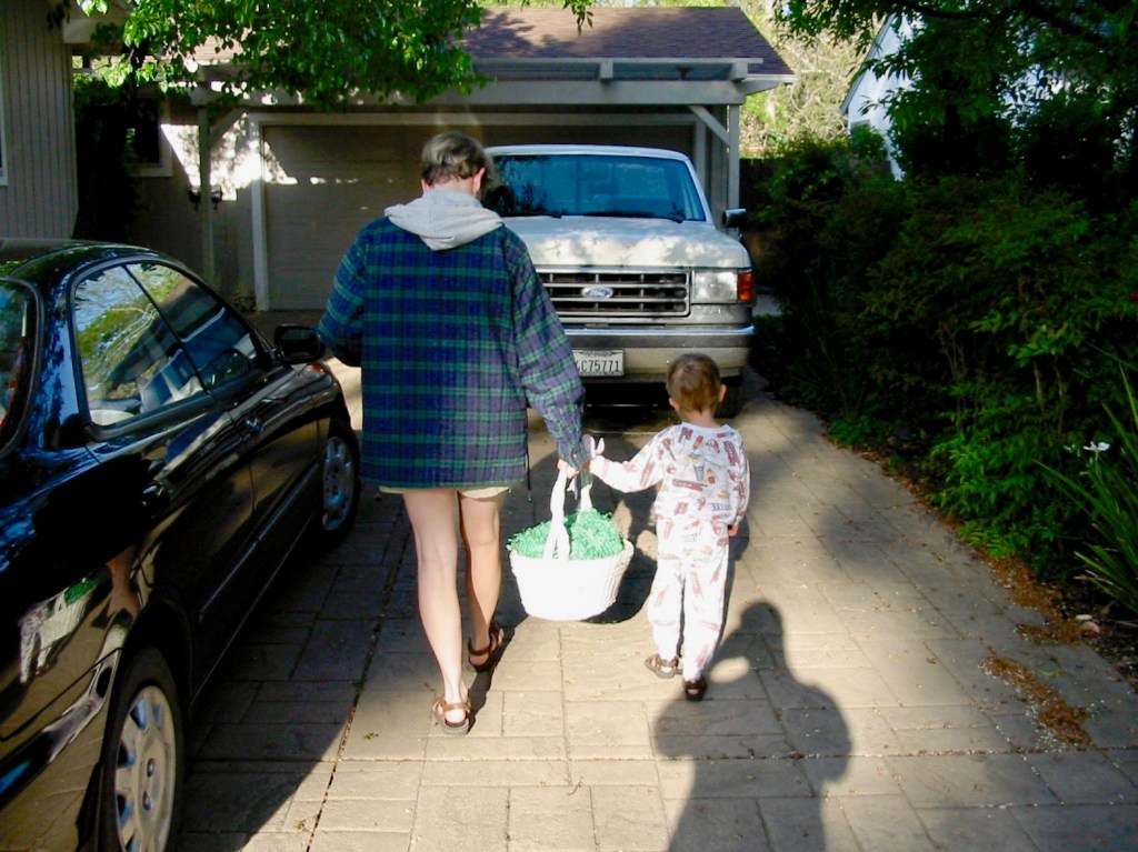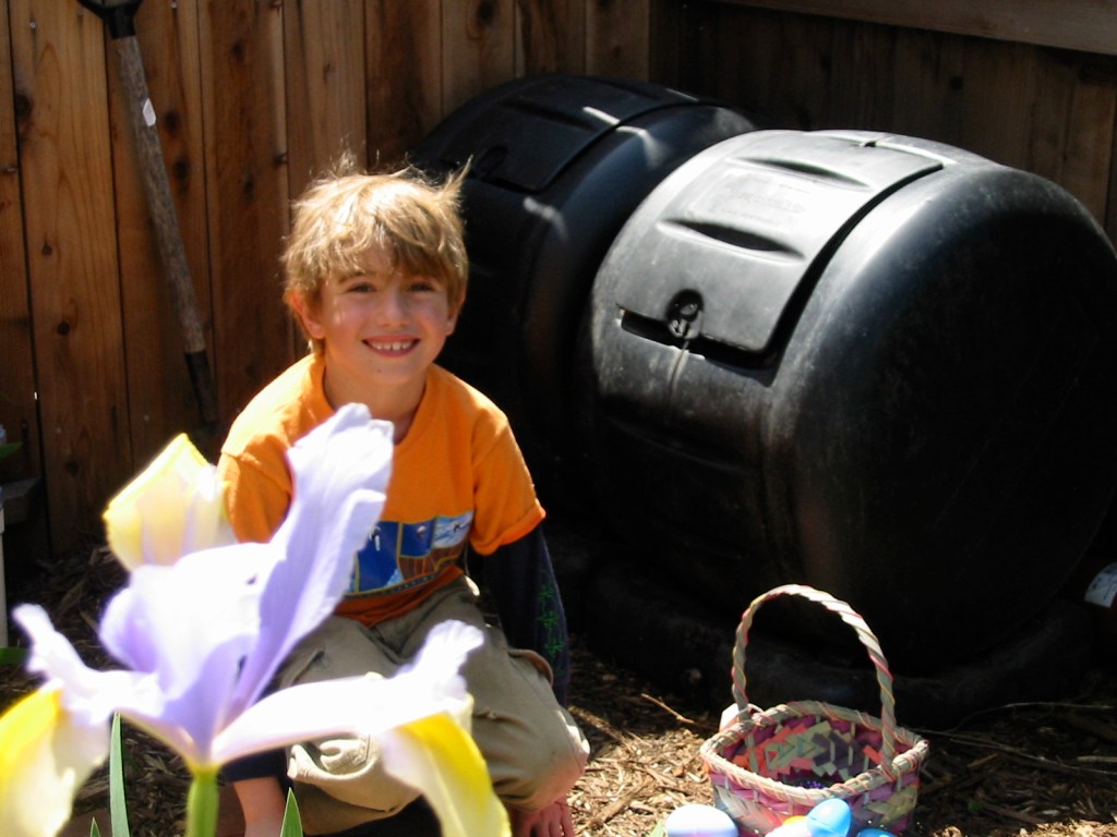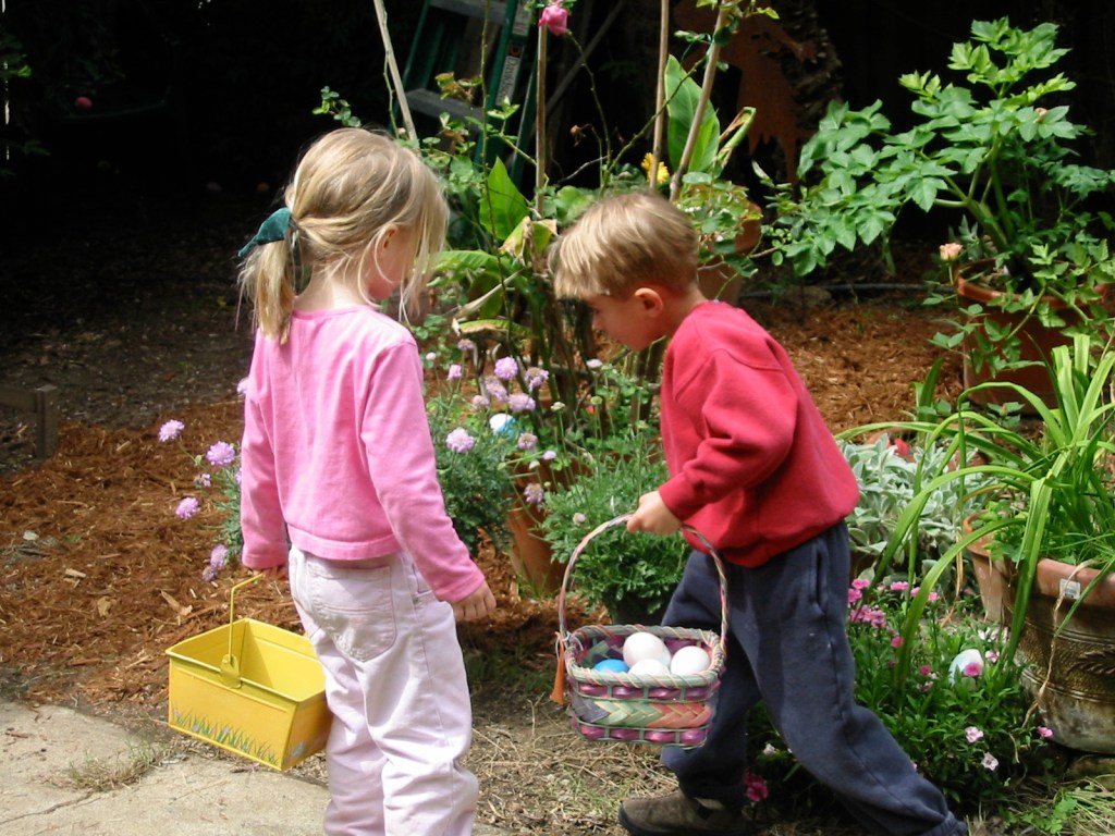In 2006, this is at the Mooney-McCarthy’s… kids are definitely getting older (now 7 years old) and now we’re leaning more toward a Solstice Celebration… (yep, those are compost bins). I’m pretty sure we were at the M-M’s over the course of many years.. 4-5.. but don’t seem to have pics at the ready for those years. They were elaborate: we’d deliver tiny items to Samantha days in advance (hair gizmos, coins, candies, tiny toys & trinkets) and, if we had them, dozens of empty plastic eggs. She’d stuff them and hide them. There were always a ton of families and kids, in a beautiful garden with great food. This tradition petered out probably around 9 or 10 years old.
