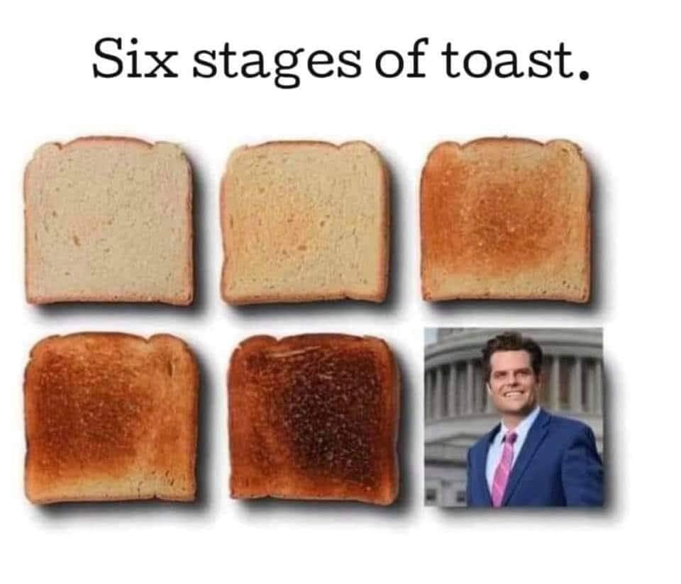 And I just gotta say…. the predicament that Gaetz has created for himself — faux extortion charges, sex trafficking, sex with underage minors, orgies, hula hoops, House floor boasty show-and-tells, and god knows what else — is just all utterly DELICIOUS. Couldn’t happen to a more repulsive, repugnant BMOC-wannabe.