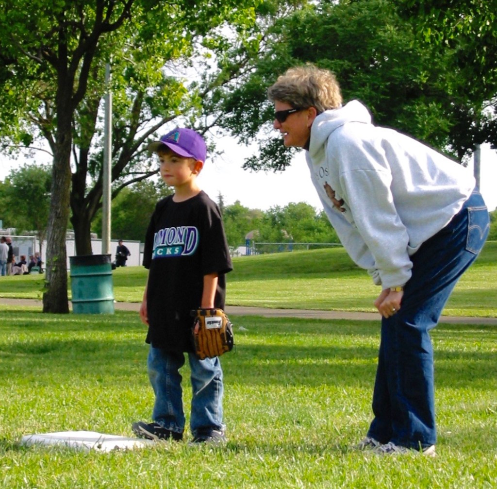 As it’s opening week of baseball season, how about a photo from an April long ago, at the beginning of Peter’s baseball career. T-ball. Peter on first. Would love to know what we’re plotting; it looks good.
