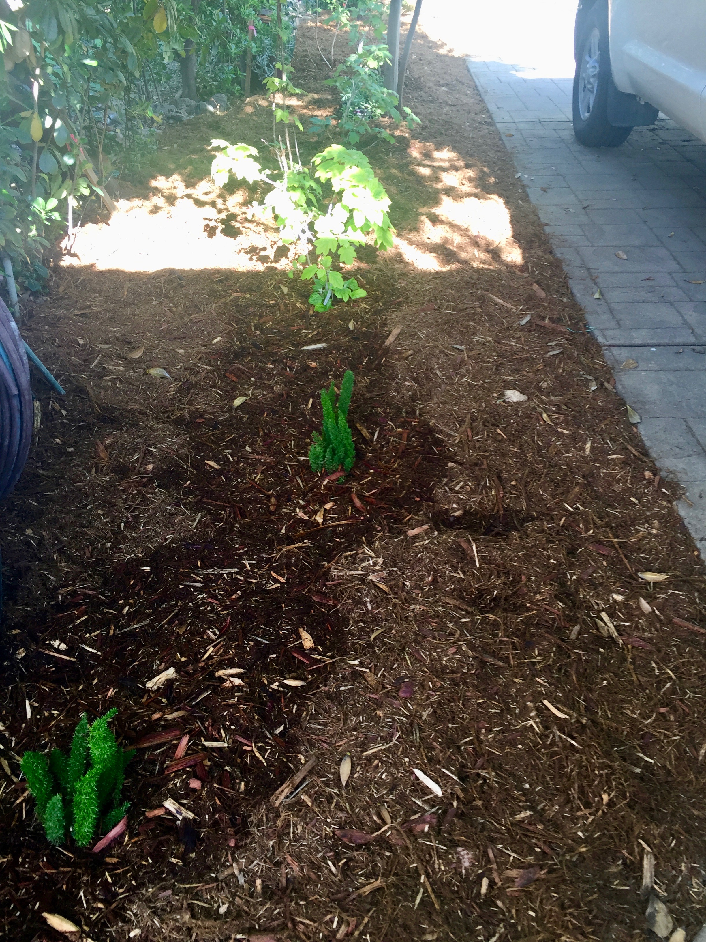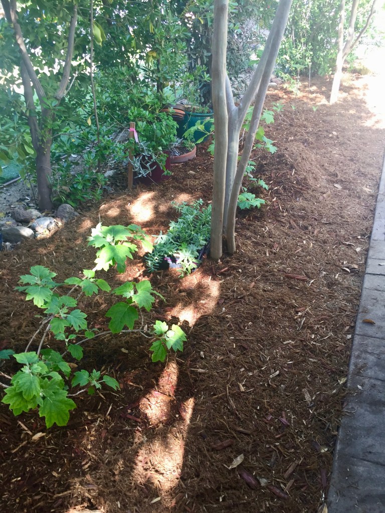 Ruben and crew worked on the north front side yard. Yay! Cleared out a bunch of stuff, planted numerous plants, laid irrigation, and finally bark. Look at those hydrangeas…