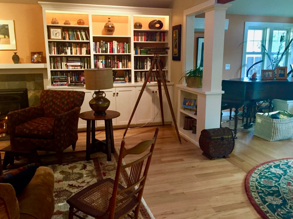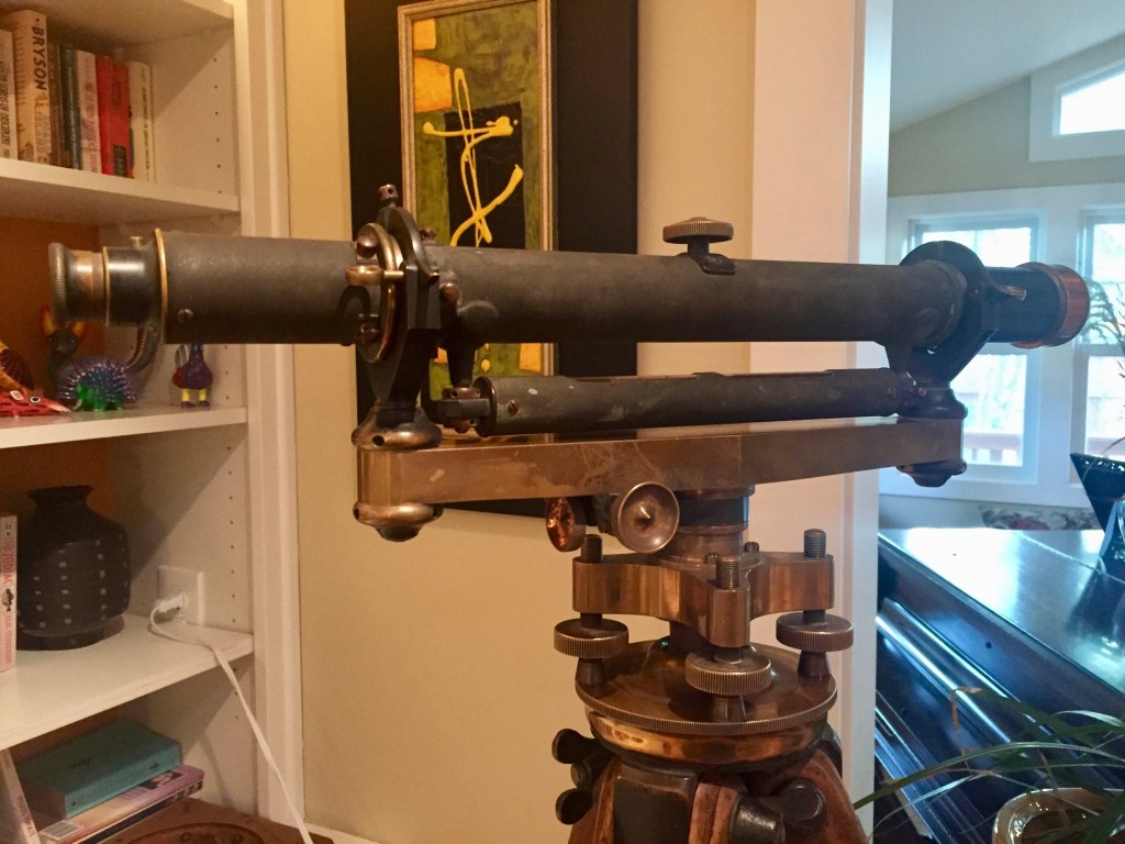 And finally, Jim finished spuzzing up his antique survey tool. He’d have a more accurate name for it. It’s gorgeous and looks like the space was designed especially for it. It’s our new conversation piece.
