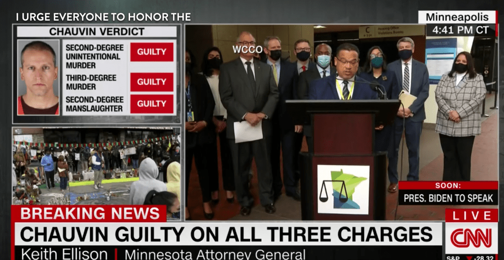 Even though we all watched a murder in process for ten minutes in broad daylight, a lot had to come together for us to arrive at this point today. It was a girl’s chance recording of the entire 9 1/2 minutes, it was the shock and outrage of a nation numbed by a pandemic, it was the appointment of Keith Ellison to the case, it was the breakdown of the blue wall — a whole bunch of police officers compelled to testify against one of their own — and somehow a jury came together to render a unanimous verdict.