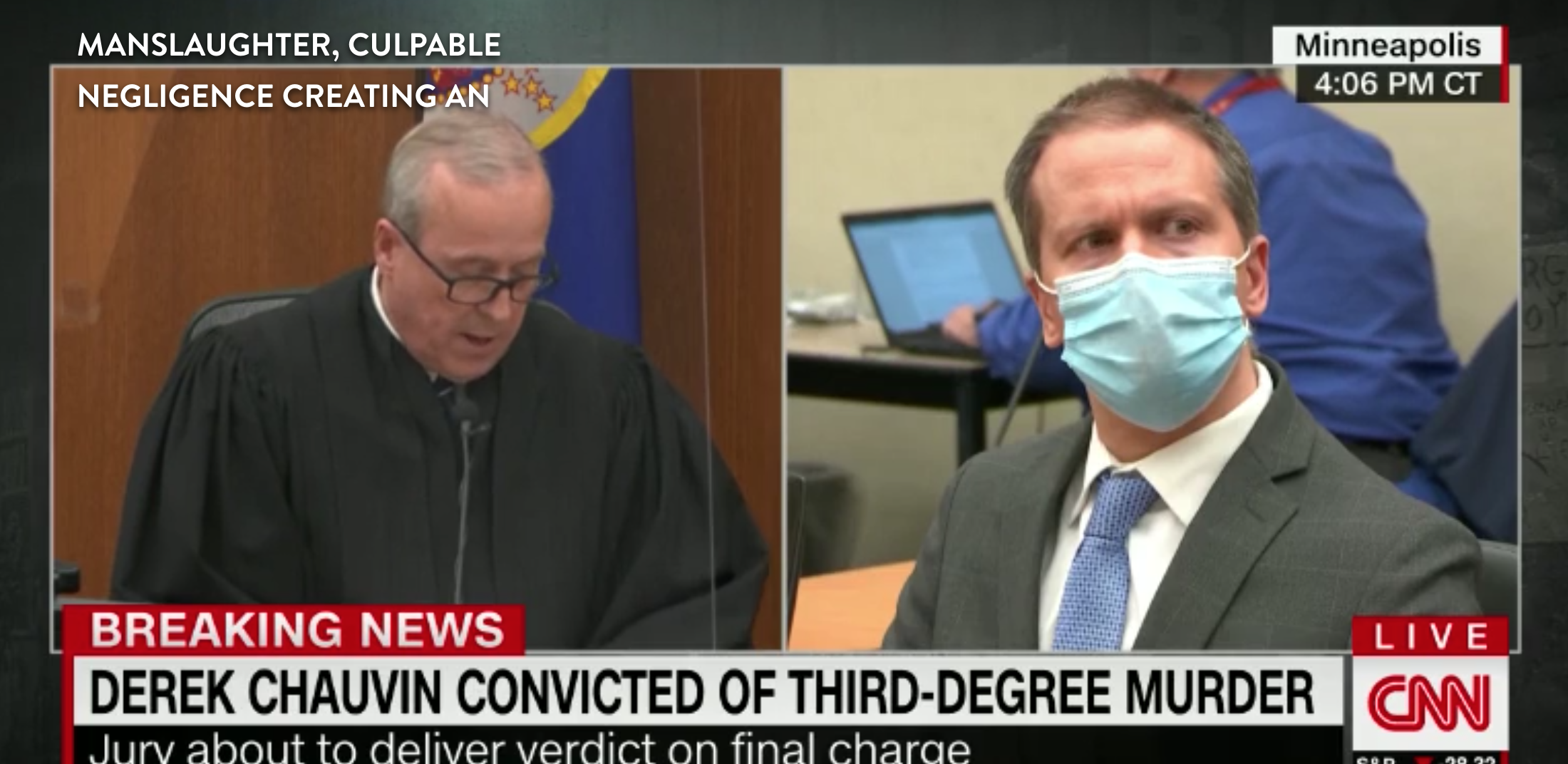 Judge Cahill read the jury’s verdict/s of guilty on three counts (after just ten-ish hours of deliberations), then Chauvin was handcuffed and remanded.