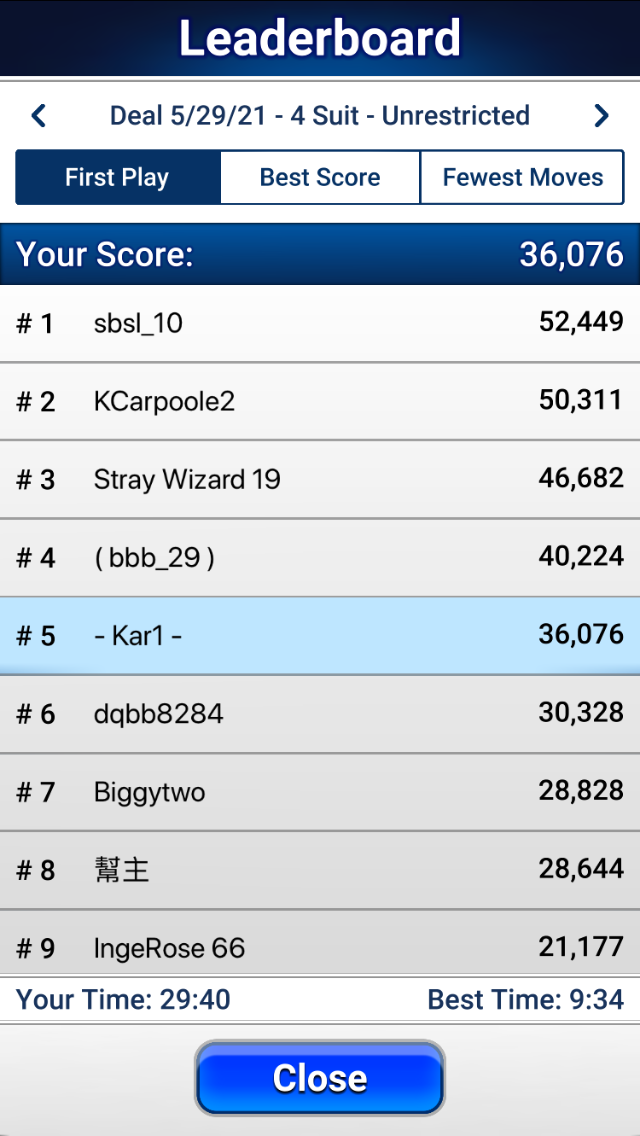 It’s not a regular occurrence, but from time to time, maybe once a month or two, I’ll end up on the leader board. They measure time, number of moves and overall score. It’s even better if it’s a “first play.” This may be my best showing: 5th in the entire world!