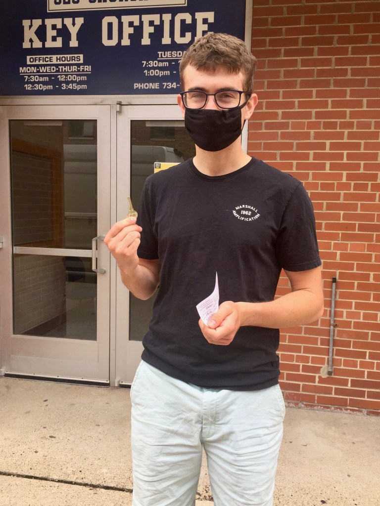 What we were really doing on campus this Monday morning, though, was searching for the key office. This was HUGE: after almost a year, Peter is finally going to be able to walk into the Mechanical Engineering building, into his grad student office, and work. His group will be sharing the large office space with another group and they’ve developed an alternating schedule to ensure that there are no more than three students in the office at any given time — a Covid precaution — but at last… he’ll be able to leave his little room in the coop and 1) work on campus, 2) work together with other folks in his lab. This was a very significant day. See? Happy Peter.