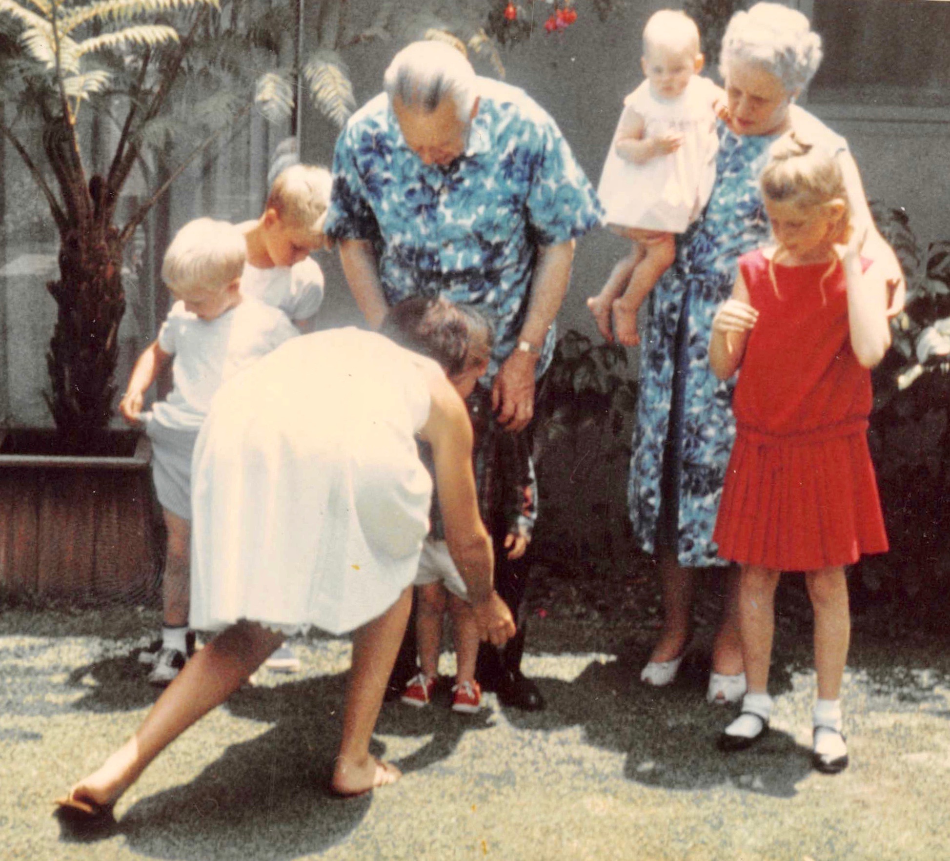 Well, we are all gathering for a group shot: Grandma and Grandpa with their 5 (at the time) grandchildren. Mom’s fixing some problem.. and everyone’s watching, maybe searching for something? Chris is checking his pocket? Jay’s looking at his feet? Matt, in the red Keds, is getting a diaper check? I remember her sandals. I believe Grandma and Grandpa had just returned from Hawaii!