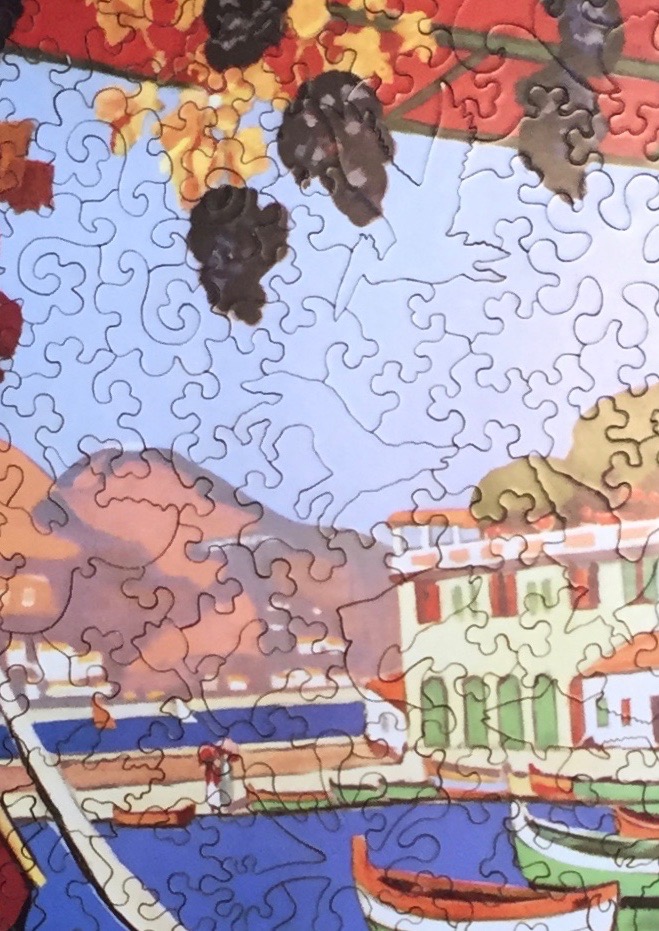 I loved this puzzle… less than 500 pieces, but so challenging and clever! Here’s a close up of the pieces. You can see pieces in the shapes of a tulip, a shark, a wolf, a butterfly, birds… just amazing.