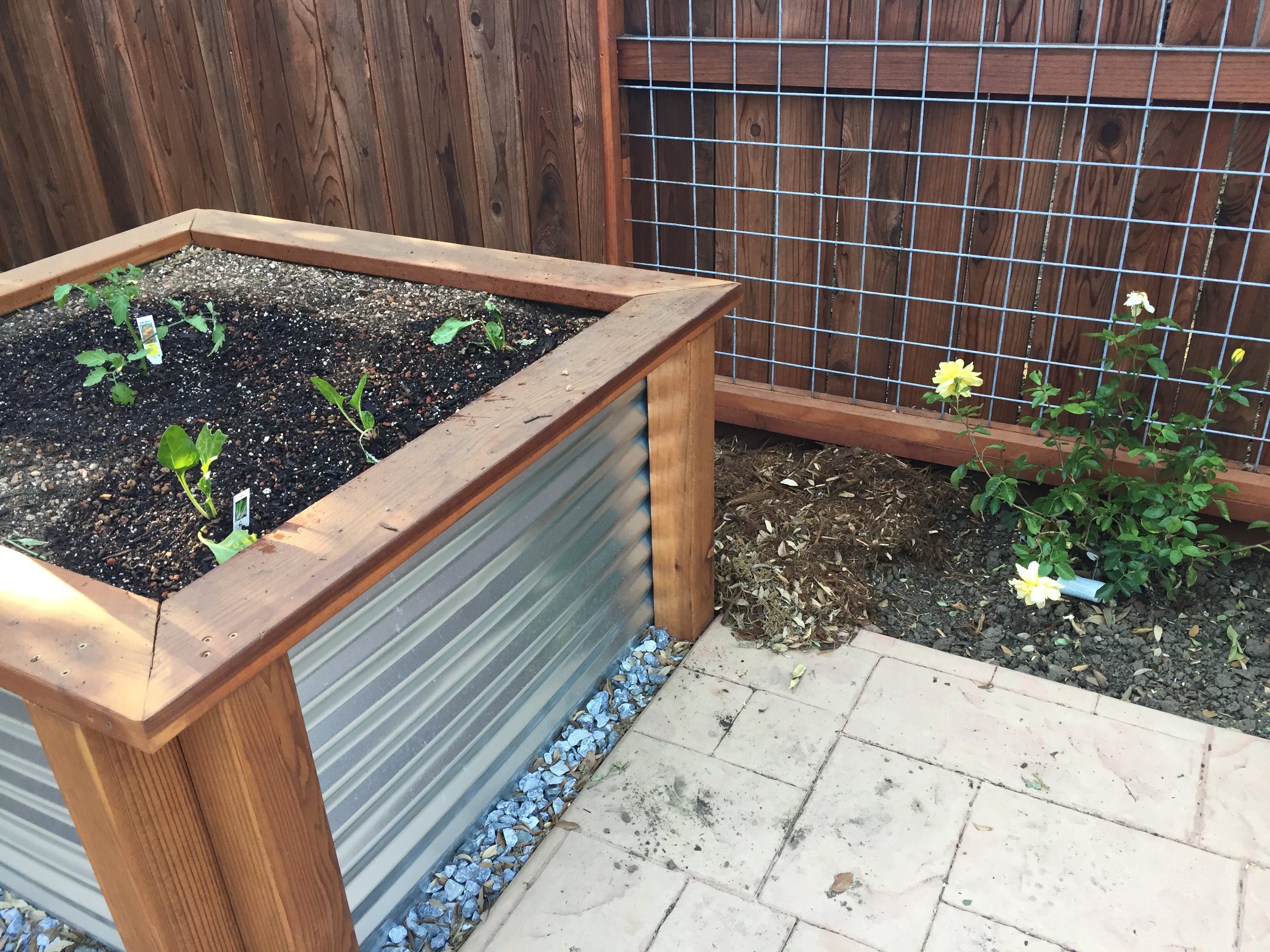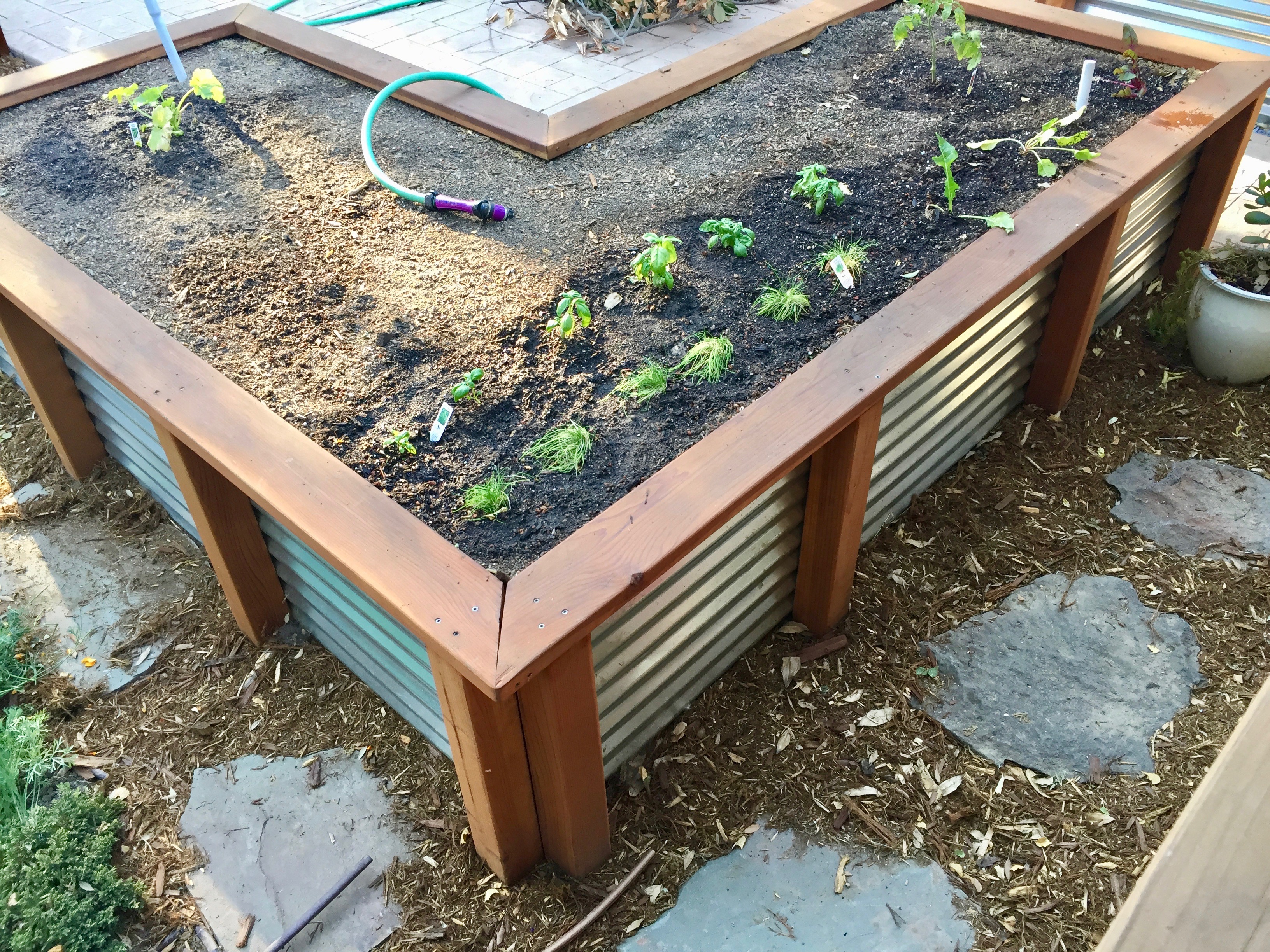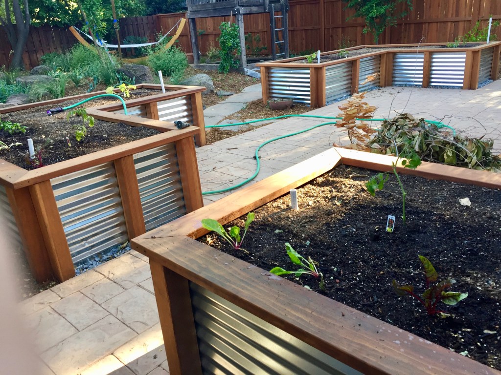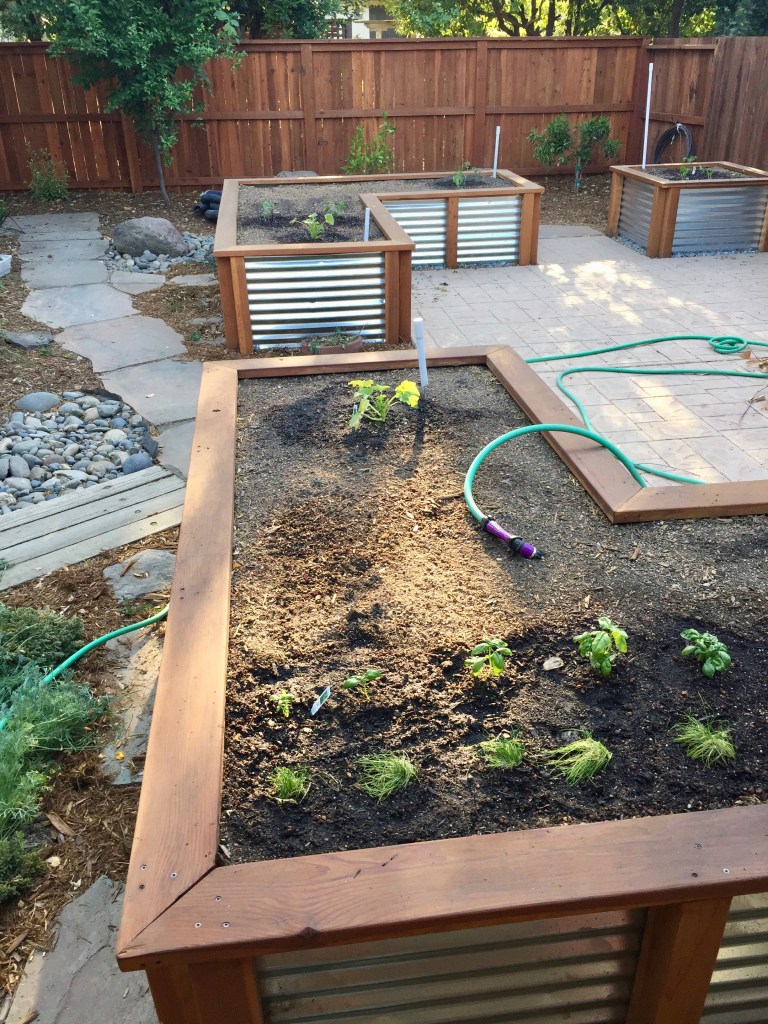 Mary came over today to help me start the garden. She had some great suggestions (including buying a lot more starts and seeds because there is a lot of room in those beds!). So.. here’s how my garden grows: